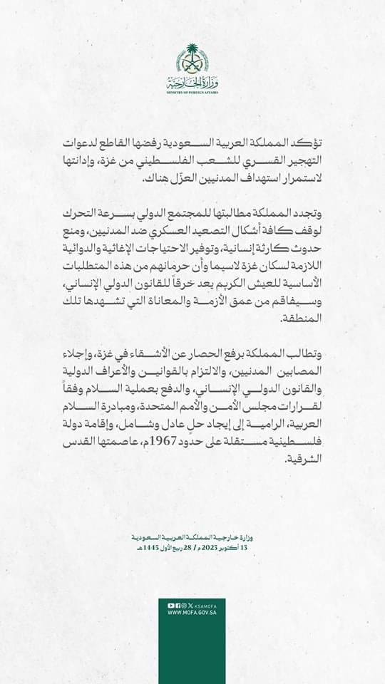 أكدت السعودية رفضها القاطع لدعوات التهجير القسري للشعب الفلسطيني من غزة وإدانتها لاستهداف المدنيين العزّل هناك.