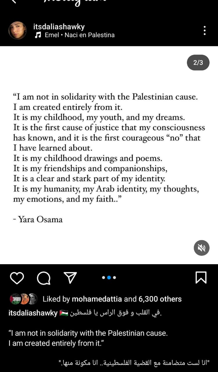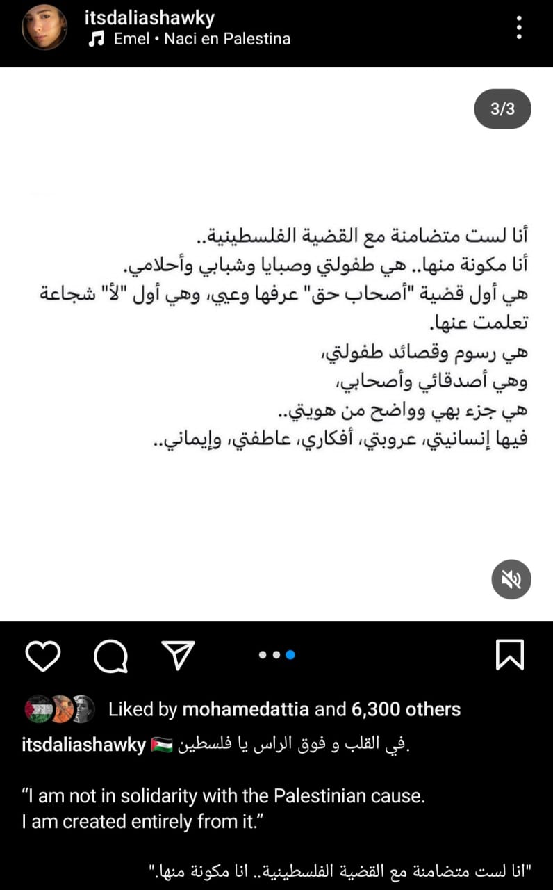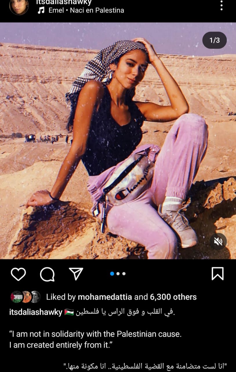 دعمت الفنانة داليا شوقي الشعب الفلسطيني،وذلك عبر حسابها الخاص بموقع تبادل الصور والفيديوهات"انستجرام".