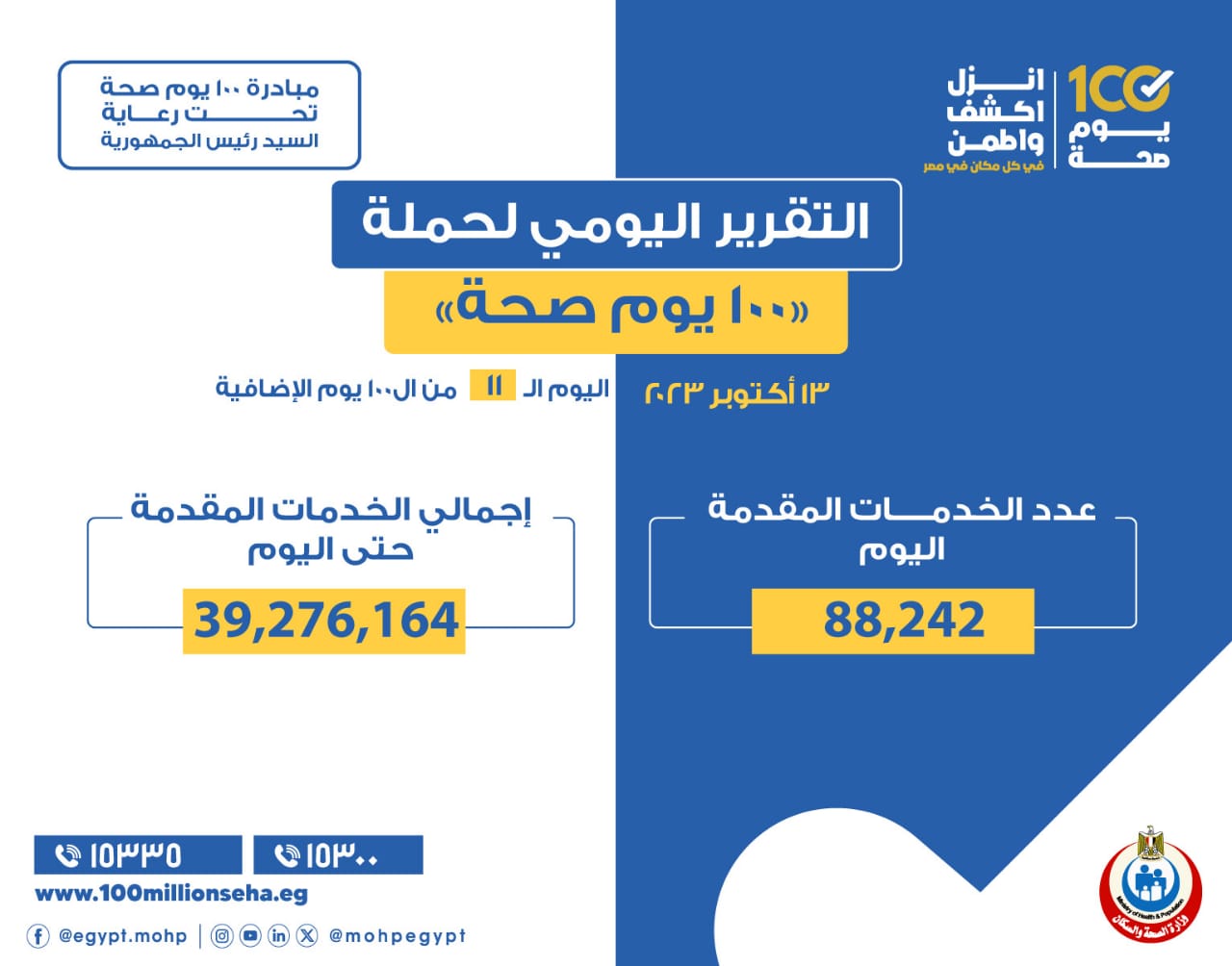أعلن الدكتور خالد عبدالغفار وزير الصحة والسكان، تقديم 88 ألفا و242 خدمة، من خلال حملة «100 يوم صحة» أمس الجمعة 13 أكتوبر، في جميع محافظات الجمهورية.