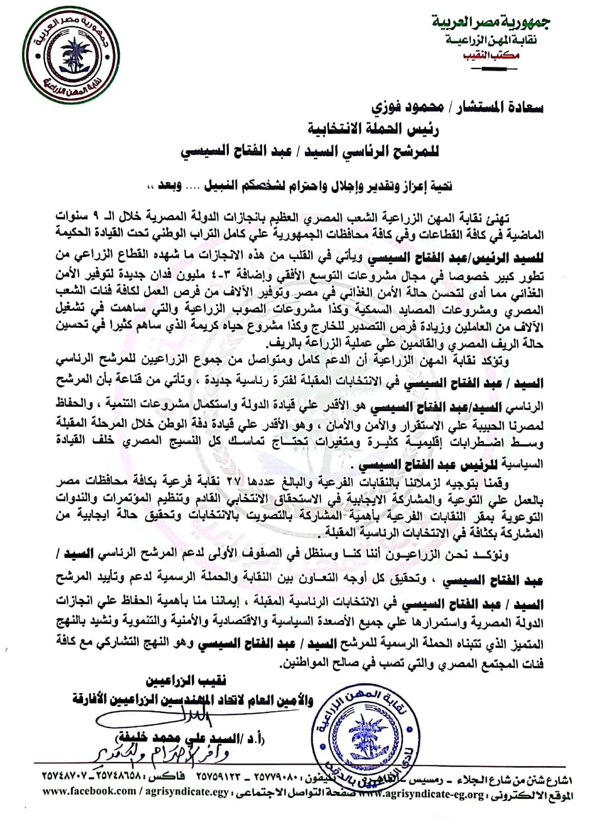 الحملة الانتخابية للسيسي تتلقي خطاباً من نقابة المهن الزراعية تعلن فيه عن تأييدها له