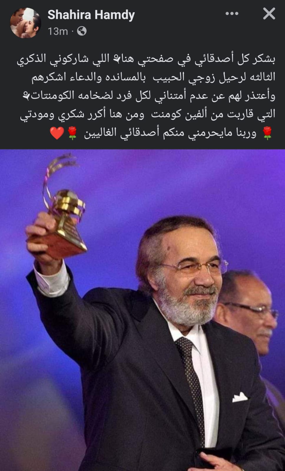 بشكر أصدقائي اللي شاركوني ذكرى رحيل زوجي الحبيب .. شهيرة تشكر أصدقائها في ذكرى رحيل محمود ياسين