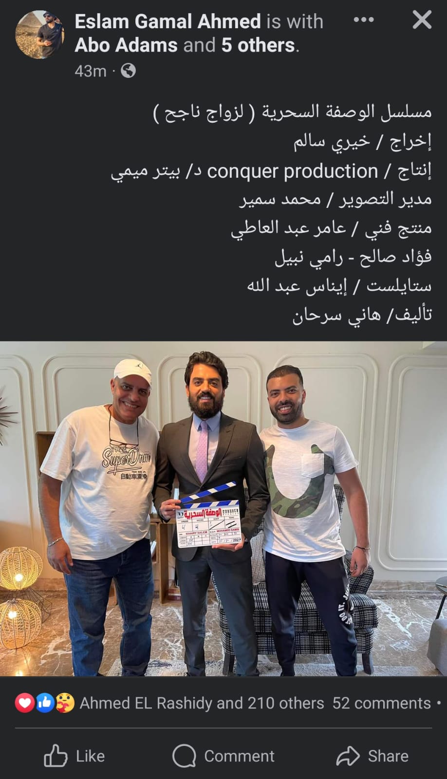 نشر الفنان إسلام جمال صورة على صفحته الرسمية عبر موقع التواصل الاجتماعي “ فيسبوك ” و علق قائلا “ مسلسل الوصفة السحرية ( لزواج ناجح )، إخراج خيري سالم، إنتاج Conquer Production د/ بيتر ميمي، مدير التصوير محمد سمير، منتج فني عامر عبد العاطي و فؤاد صالح و رامي نبيل، ستايليست إيناس عبد الله، تأليف هاني سرحان ” .