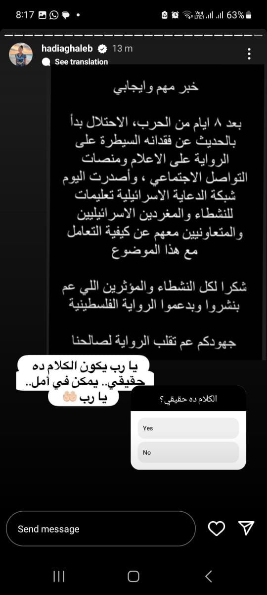 هادية غالب.. وكتبت هادية غالب قائلة "خبر مهم وإيجابي الإحتلال بدأ بالحديث عن فقدانه السيطرة على الرواية على الإعلام ومنصات التواصل الاجتماعي،وأصدرت اليوم شبكة الدعاية الإسرائيلية تعليمات للنشطاء والمغردين الإسرائيلين والمتعاونين معهم عن كيفية التعامل مع هذا الموضوع شكرا لكل النشطاء والمؤثرين اللي دعم بنشر وبدعموا الرواية الفلسطينية جهودكم عم تقلب الرواية لصالحنا".
