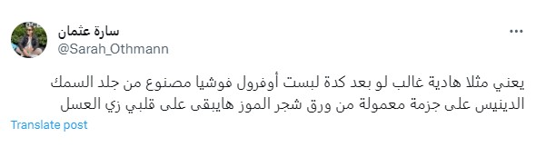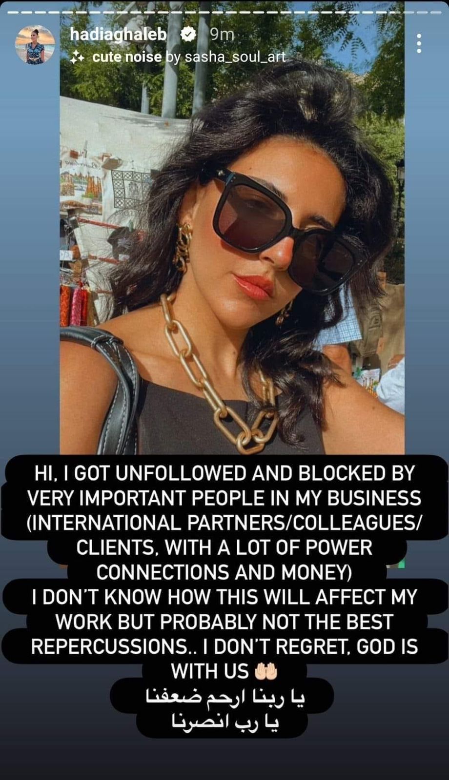 وبعد إعلان دعمها لفلسطين ، ندم عدد من رواد السوشيال ميديا على الانتقادات التى كانوا يوجهونها لها من قبل بسبب طريقتها فقالت أحد المغردين " يعني مثلا هادية غالب لو بعد كدة لبست أوفرول فوشيا مصنوع من جلد السمك الدينيس على جزمة معمولة من ورق شجر الموز هايبقى على قلبي زي العسل".