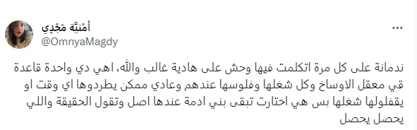 وقالت أخرى " ندمانة على كل مرة اتكلمت فيها وحش على هادية غالب والله، اهي دي واحدة قاعدة قي معقل الاوسـ*اخ وكل شغلها وفلوسها عندهم وعادي ممكن يطردوها اي وقت او يقفلولها شغلها بس هي اختارت تبقى بني ادمة عندها اصل وتقول الحقيقة واللي يحصل يحصل