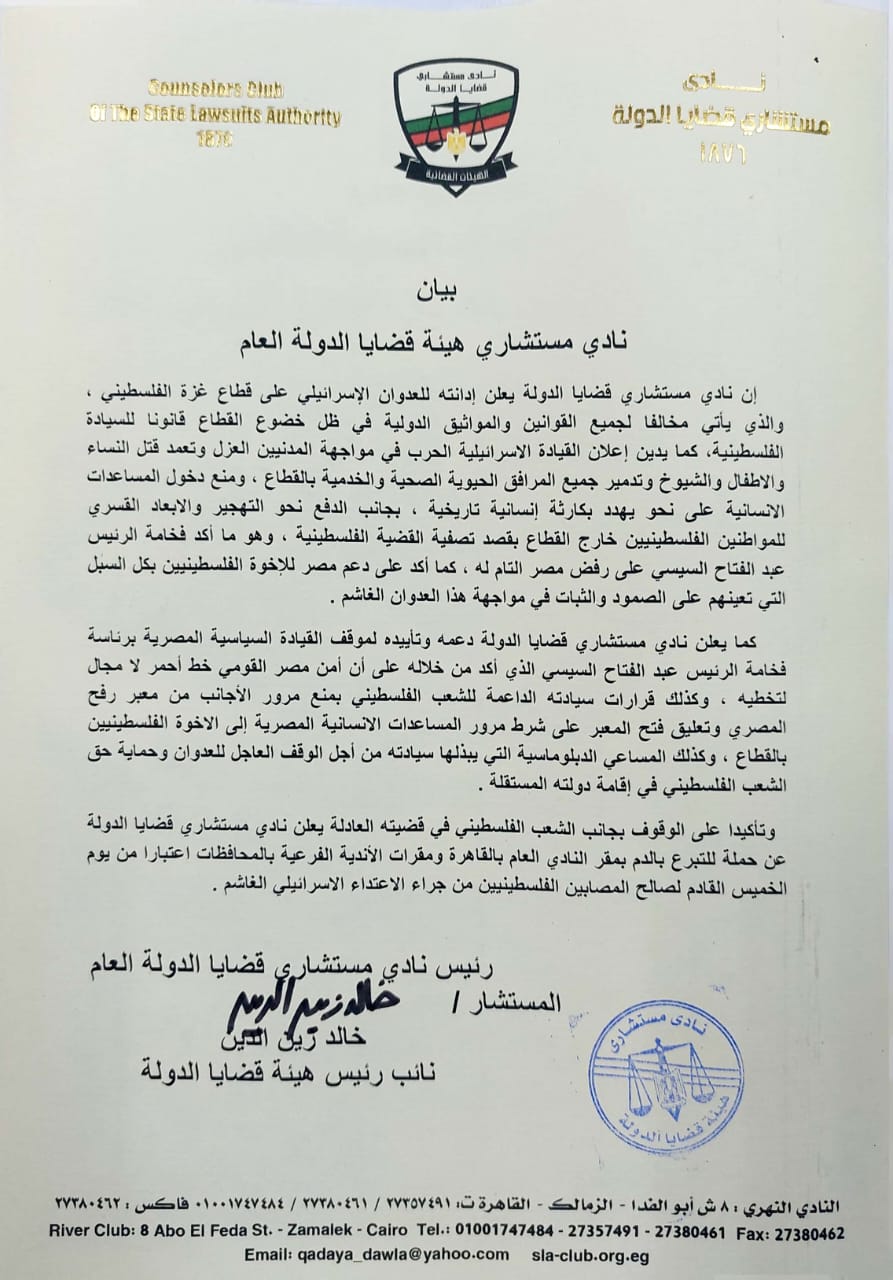 أعلن نادي مستشاري قضايا الدولة إدانته للعدوان الإسرائيلي على قطاع غزة الفلسطيني، والذي يأتي مخالفا لجميع القوانين والمواثيق الدولية في ظل خضوع القطاع قانونا للسيادة الفلسطينية.