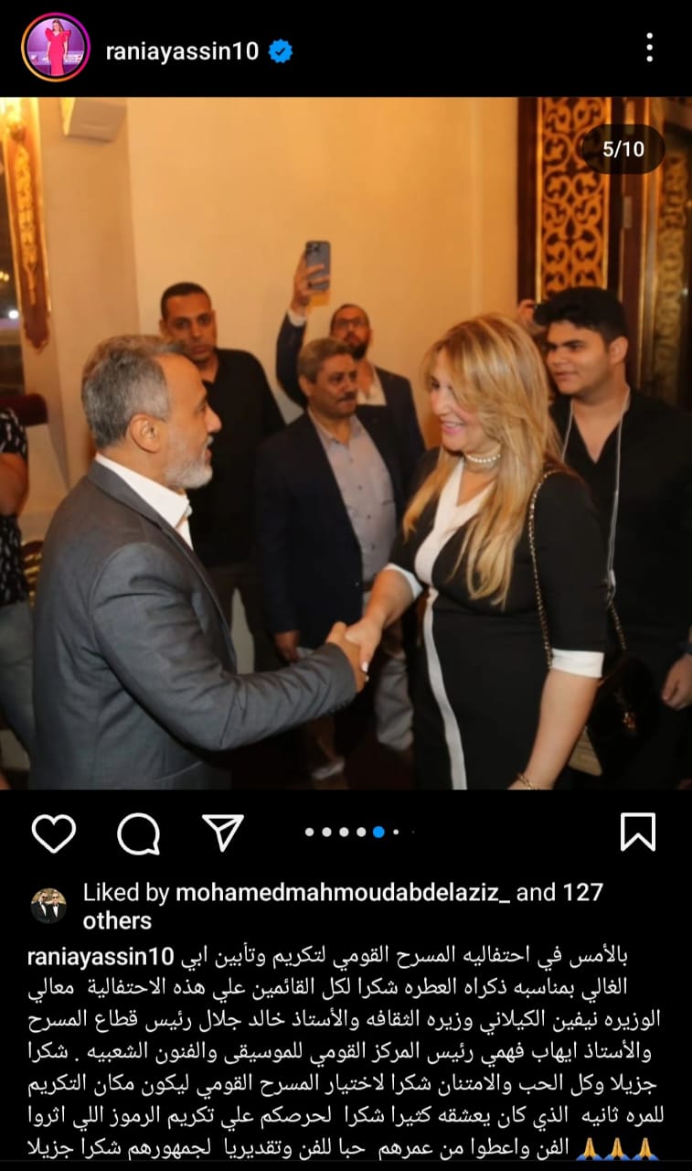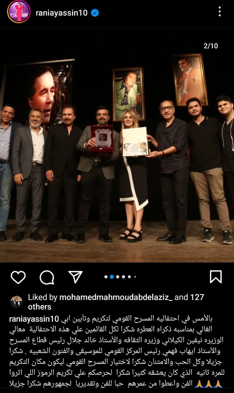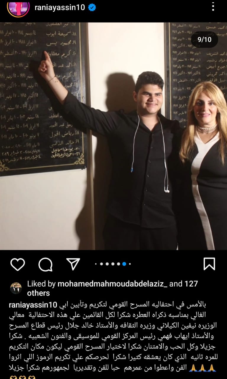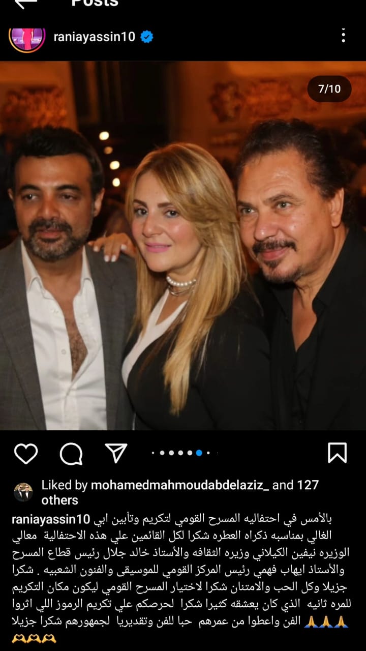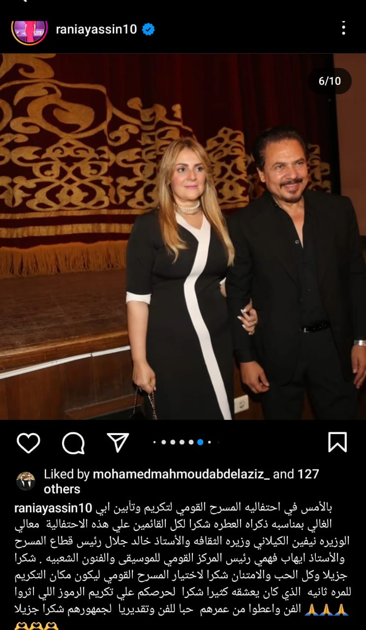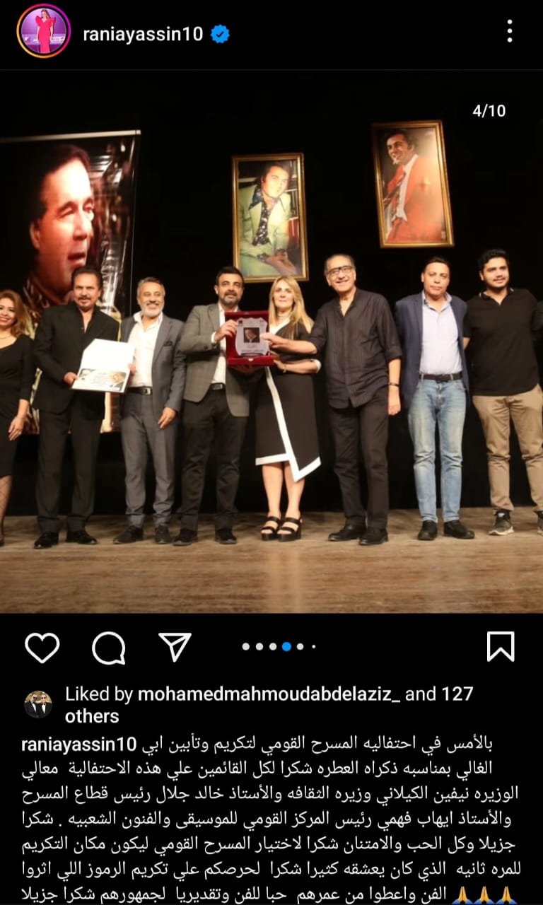 حيث ظهر معاها في الصور شقيقها الفنان عمرو محمود ياسين،زوجها النجم محمد رياض ونجلها عمرو محمد رياض، الفنان الكبير محمد أبو داوود وعلقت رانيا قائلة"بالأمس في إحتفالية المسرح القومى تكريم وتأبين أبي الغالي بمناسبة ذكراه العطرة شكرا لكل القائمين على هذه الإحتفاليةمعالي الوزيرة نيفين الكيلاني وزيرة الثقافة والأستاذ خالد جلال رئيس قطاع المسرح والأستاذ إيهاب فهمي رئيس المركز القومى للموسيقى والفنون الشعبية شكرا جزيلا وكل الحب والامتنان شكرا لإختيار المسرح القومى ليكون مكان للتكريم للمرة التانية الذي كان يعشقه كثيرا شكرا لحرصكم على تكريم الرموز اللي اثروا في الفن وأعطوا من عمرهم حبا للفن وتقديرا لجمهورهم شكرا جزيلا".