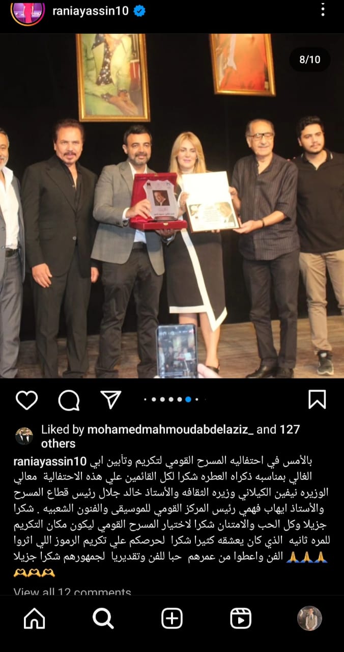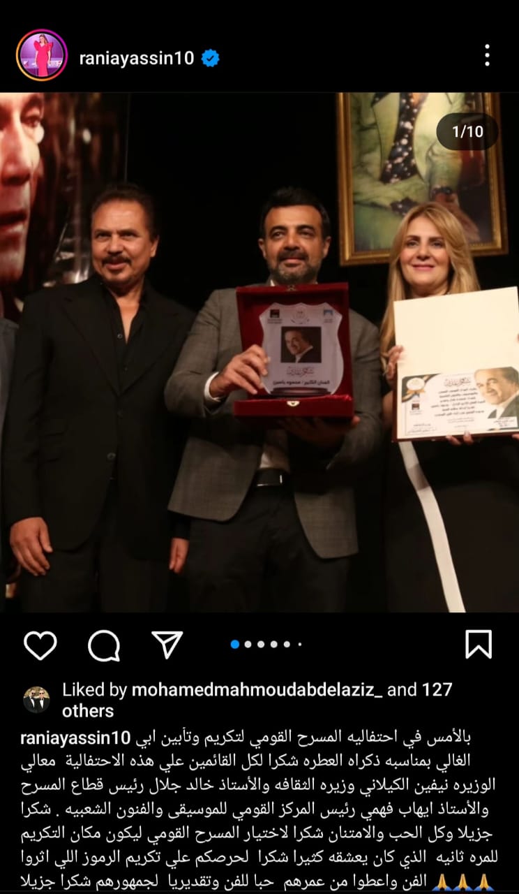 إحتفلت الفنانة رانيا ياسين بتكريم والدها الراحل الفنان محمود ياسين من المسرح القومى بمشاركة عدة صور من جانب التكريم،وذلك عبر حسابها الخاص بموقع تبادل الصور والفيديوهات"انستجرام".