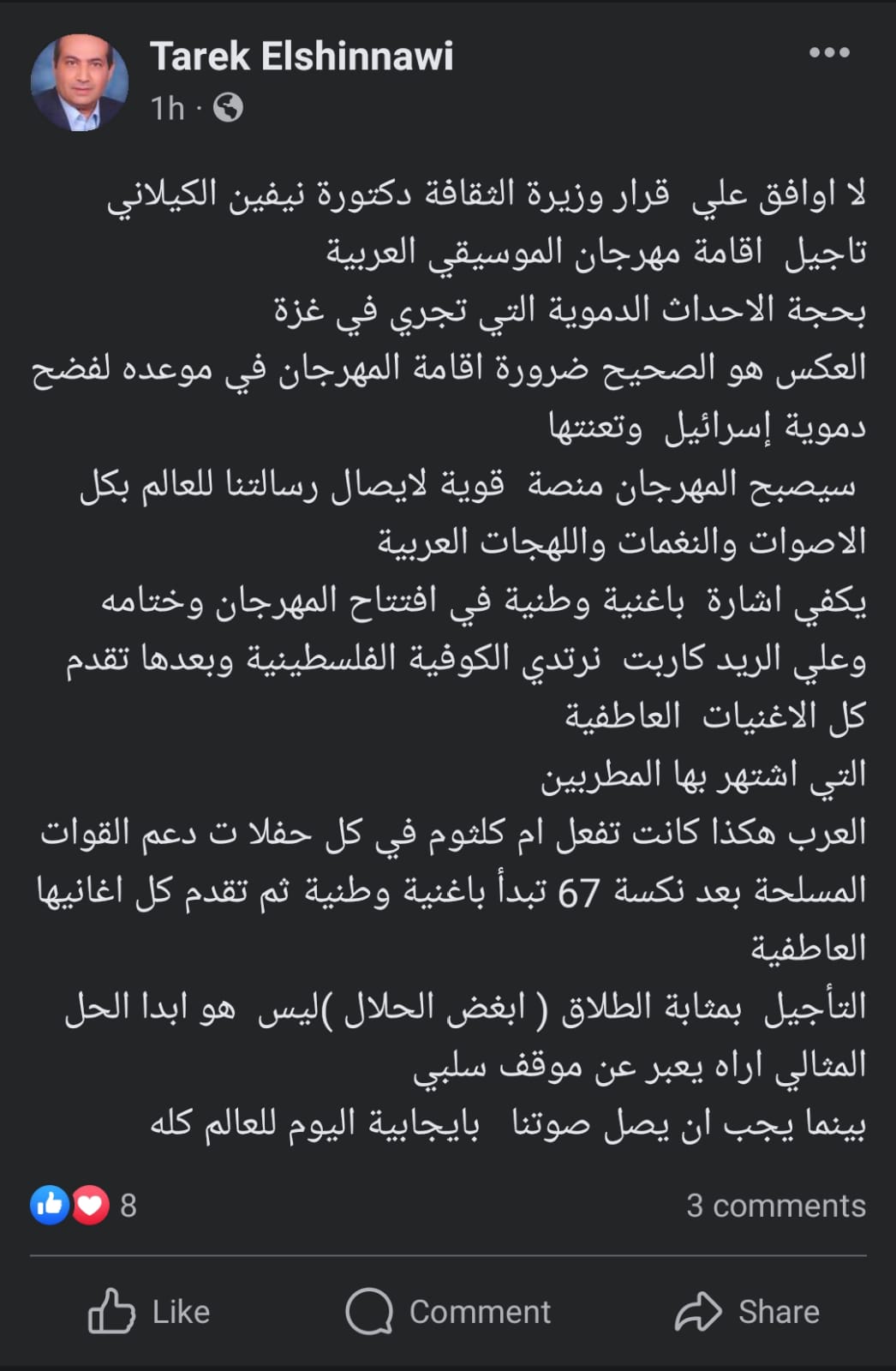 كتب طارق الشناوي منشور على صفحته الرسمية عبر موقع التواصل الاجتماعي “"فيسبوك" وعلق قائلا "لا أوافق على قرار وزيرة الثقافة دكتورة نيفين الكيلاني بتأجيل إقامة مهرجان الموسيقى العربية بحجة الأحداث الدموية التي تجري في غزة" .