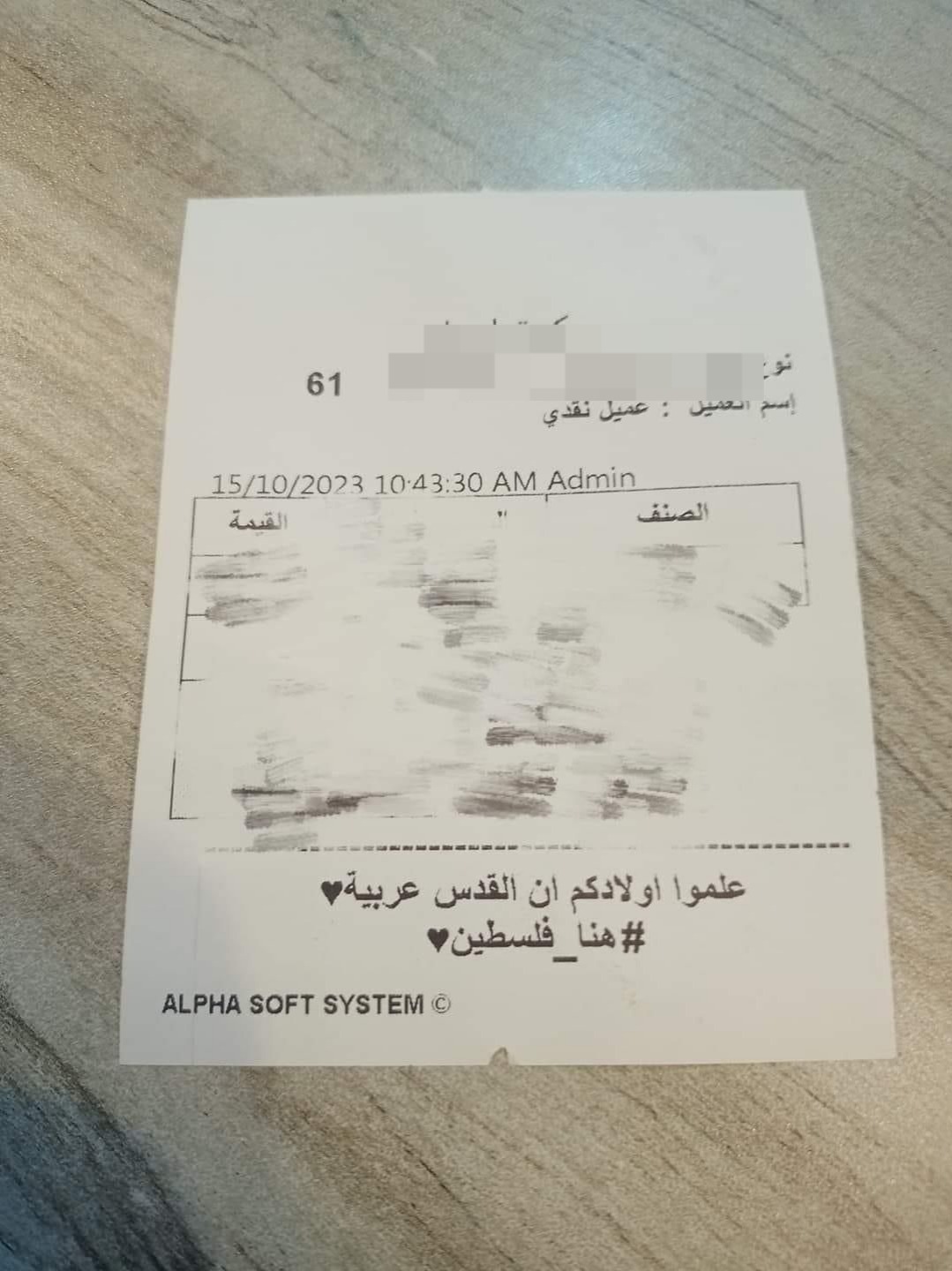 تداول رواد مواقع التواصل الاجتماعى ، صور لفاتورة أحد المطاعم فى محافظة الفيوم لدعم فلسطين وأهالى غزة ، كتب عليها “ هنا فلسطين .. علموا أولادكم أن القدس عربية”.