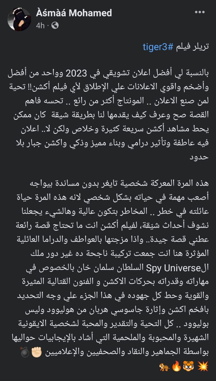 وعلق سلمان قائلا “ معجبيني يحبون رؤيتي أقوم بأدوار الأكشن، و آمل أن يكون Tiger 3 هو الهدية المثالية التي كانوا ينتظرونها ” .