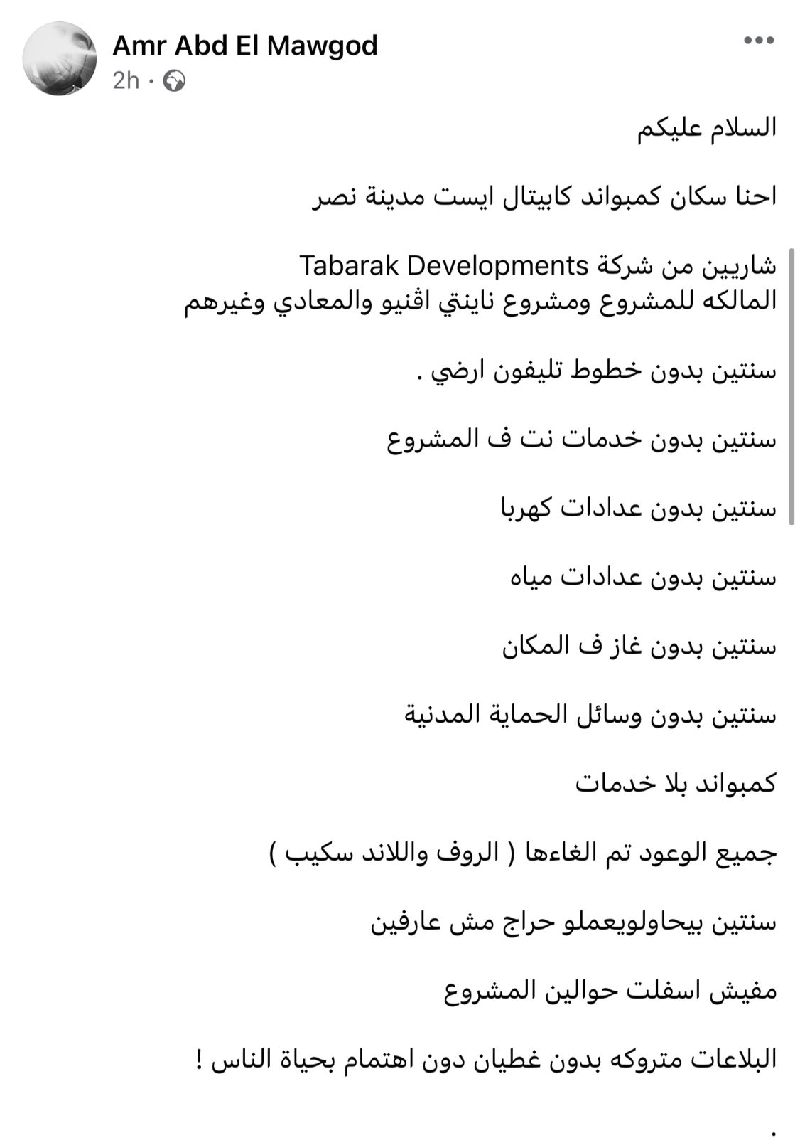 وقال صاحب المشكلة عبر السوشيال ميديا ،" السلام عليكم احنا سكان كمبواند كابيتال ايست مدينة نصر شاريين من شركة Tabarak Developments والمالكه للمشروع ومشروع ناينتي اڤنيو والمعادي وغيرهم.. سنتين بدون خطوط تليفون ارضي .. سنتين بدون خدمات نت ف المشروع.. سنتين بدون عدادات كهربا.. سنتين بدون عدادات مياه".