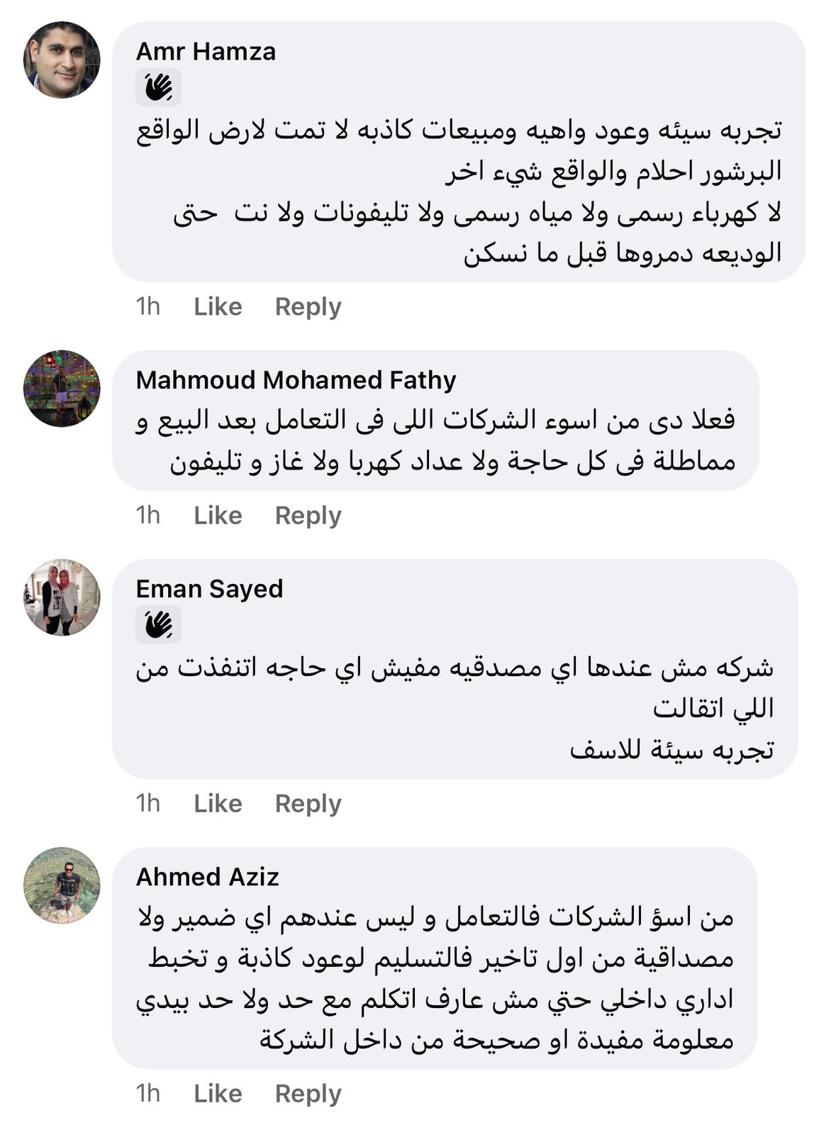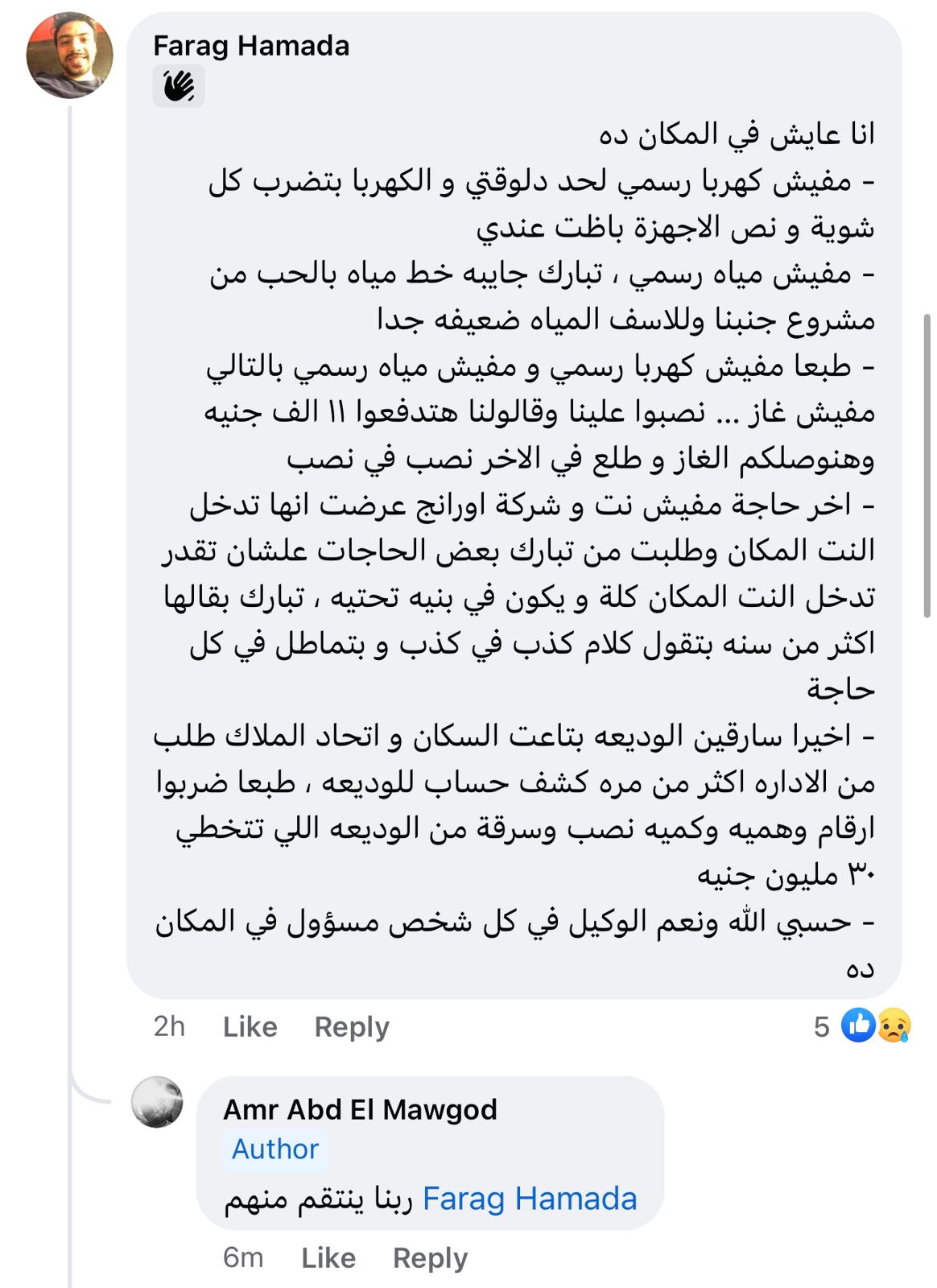 وتابع ،" سنتين بدون غاز ف المكان ..سنتين بدون وسائل الحماية المدنية.. كمبواند بلا خدمات.. جميع الوعود تم الغاءها ( الروف واللاند سكيب ).. سنتين بيحاولا ويعملو حراج مش عارفين.. مفيش اسفلت حوالين المشروع.. البلاعات متروكه بدون غطيان دون اهتمام بحياة الناس ! ".
