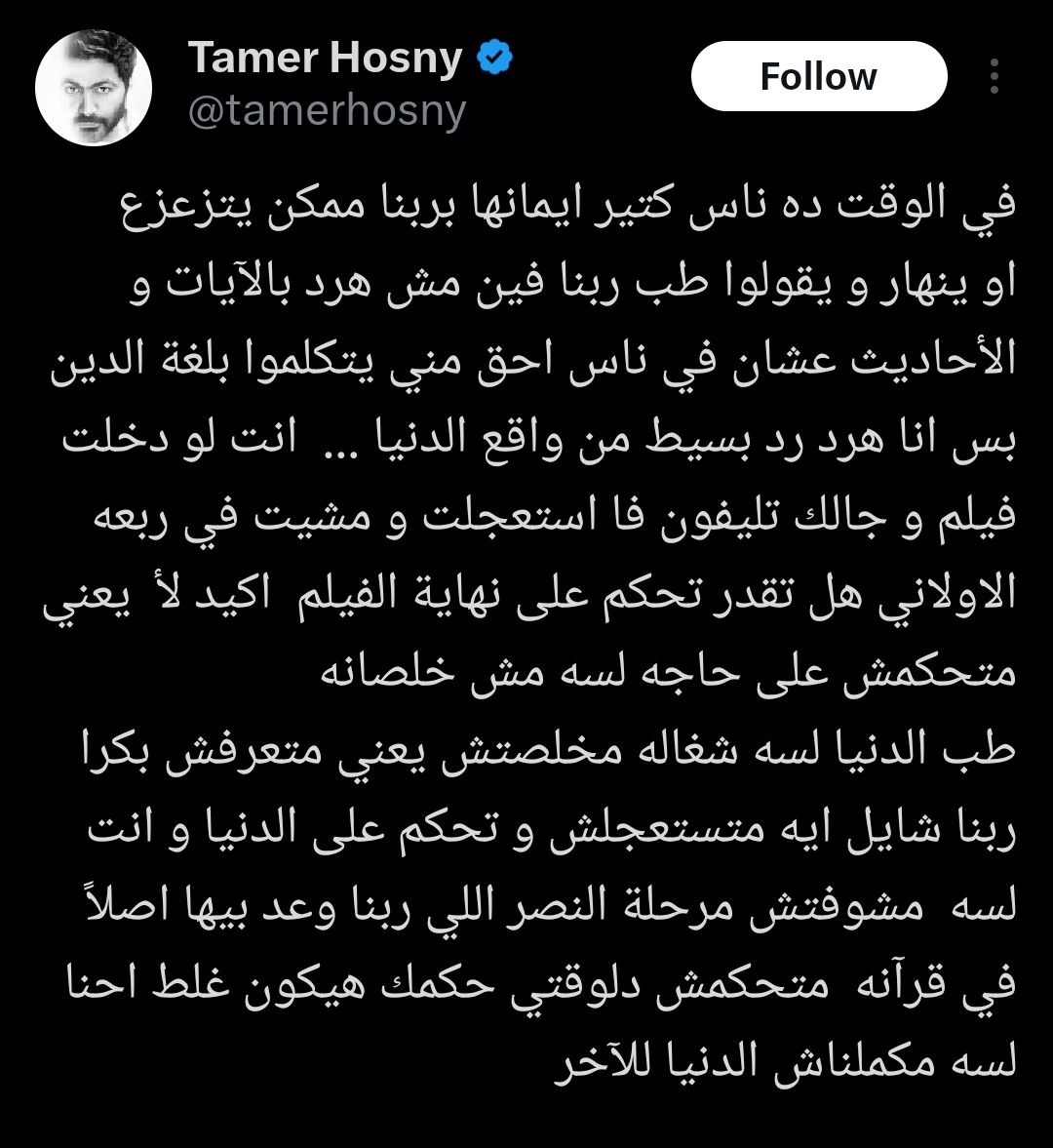 و تابع “ أنت لو دخلت فيلم و جالك تليفون فا استعجلت و مشيت في ربعه الأولاني، هل تقدر تحكم على نهاية الفيلم، أكيد لا يعني متحكمش على حاجة لسه مش خلصانة، طب الدنيا لسه شغالة مخلصتش يعني متعرفش بكرة ربنا شايل إيه، متستعجلش و تحكم على الدنيا و أنت لسه مشوفتش مرحلة النصر اللي ربنا وعد بيها أصلا في قرآنه، متحكمش دلوقتي علشان حكمك هيكون غلط، احنا لسه مكملناش الدنيا للآخر ” .