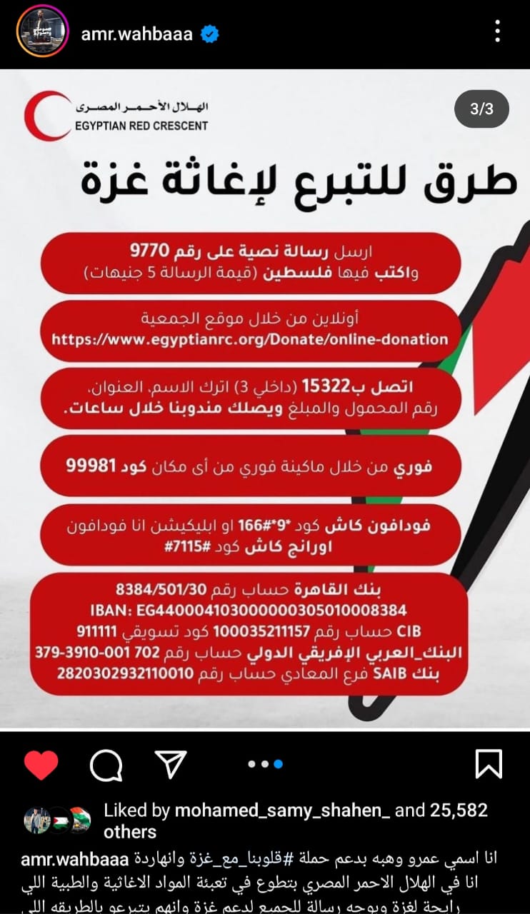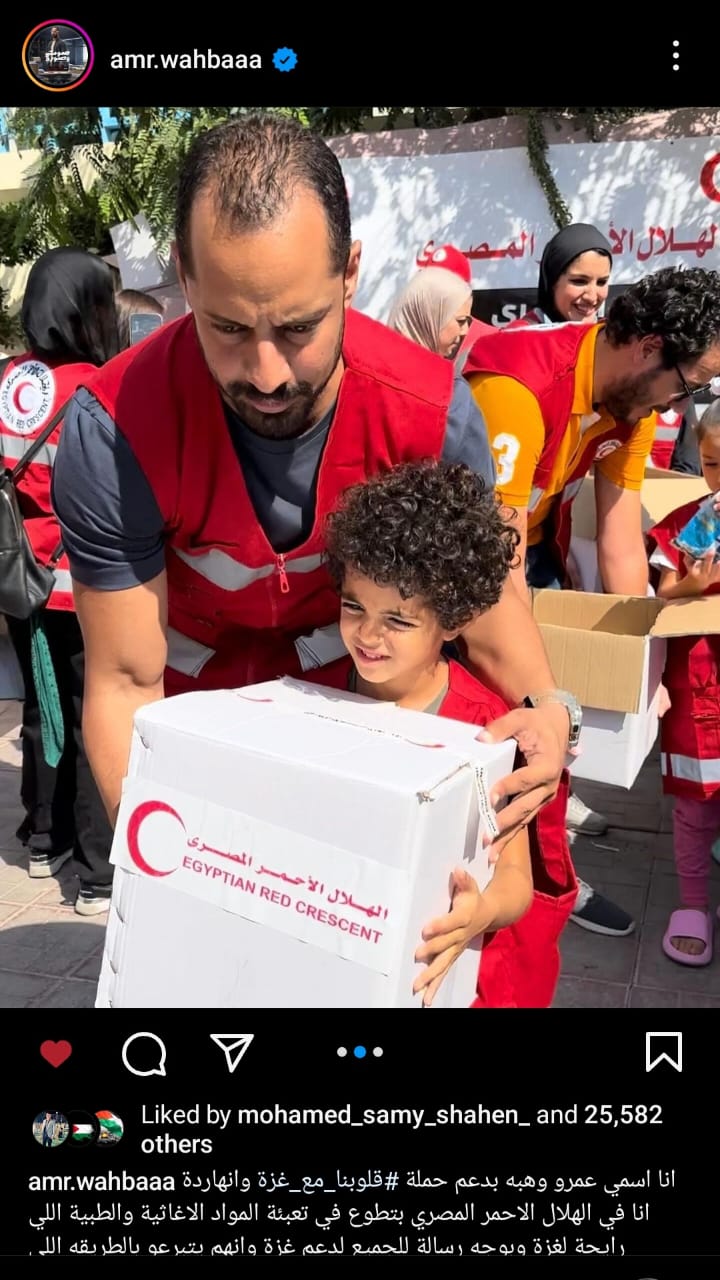 دعم الفنان عمرو وهبة حملة قلوبنا مع غزة،وذلك عبر حسابه الخاص بموقع تبادل الصور والفيديوهات"انستجرام".
