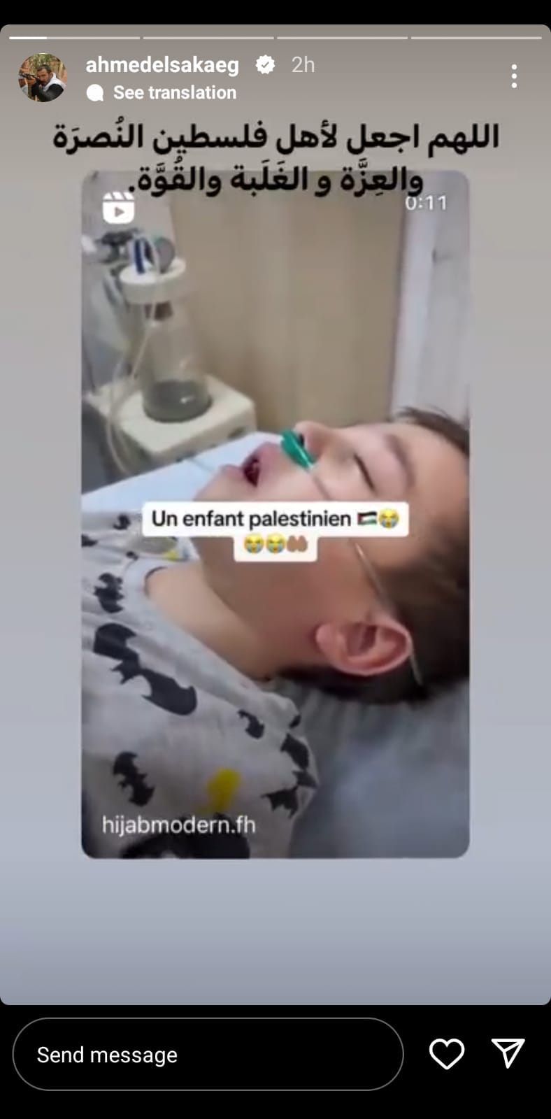 تضامن الفنان أحمد السقا مع الشعب الفلسطيني و ذلك للأحداث الأخيرة بفلسطين في الفترة الحالية، حيث نشر أحمد السقا مقطع فيديو لأحد الأطفال الفلسطينيين المصابين من خلال ستوري على صفحته الرسمية عبر موقع تبادل الصور و الفيديوهات “ إنستجرام ” .