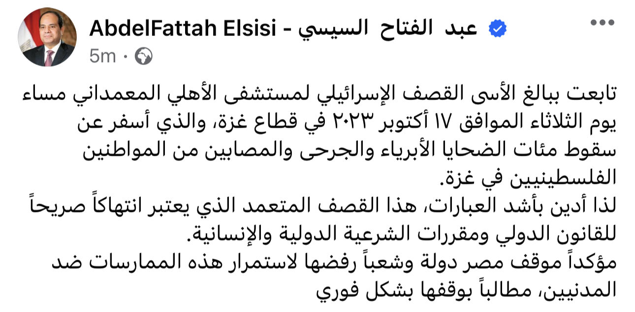 قال الرئيس عبد الفتاح السيسي "تابعت ببالغ الأسى القصف الإسرائيلي لمستشفى الأهلي المعمداني مساء يوم الثلاثاء الموافق ١٧ أكتوبر ٢٠٢٣ في قطاع غزة، والذي أسفر عن سقوط مئات الضحايا الأبرياء والجرحى والمصابين من المواطنين الفلسطينيين في غزة.