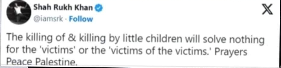كتب شاروخان تغريدة على صفحته الرسمية عبر موقع التواصل الاجتماعي “ تويتر ” و علق قائلا “ القتل بواسطة قتل الأطفال لن يحل للضحايا و ضحايا الضحايا شيئا .. لكي الصلاوات يا فلسطين ” .