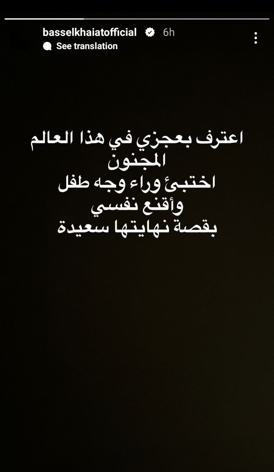 نشر باسل خياط ستوري على صفحته الرسمية عبر موقع تبادل الصور و الفيديوهات “ إنستجرام ” و علق قائلا “ أعترف بعجزي في هذا العالم المجنون .. أختبئ وراء وجه طفل و أقنع نفسي بقصة نهايتها سعيدة ” .