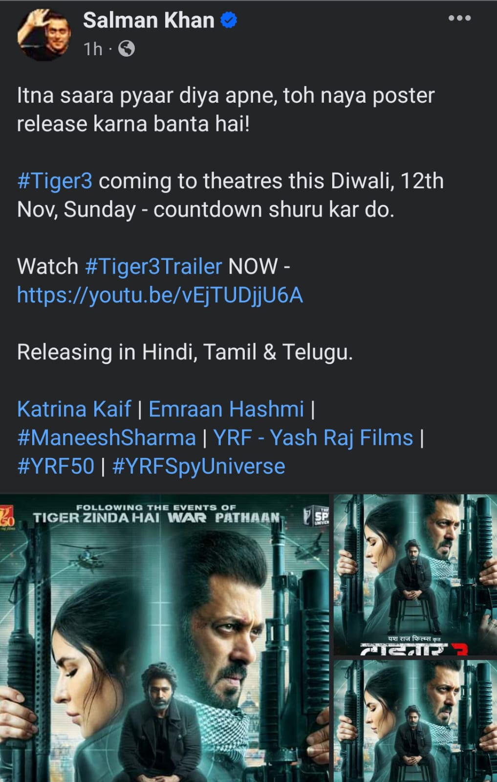 وعلق سلمان قائلا “ معجبيني يحبون رؤيتي أقوم بأدوار الأكشن، و آمل أن يكون Tiger 3 هو الهدية المثالية التي كانوا ينتظرونها ” .