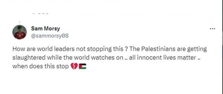 وأعلن سام مرسي لاعب إيبسويتش تاون الإنجليزي ولاعب منتخب مصر، عن تضامنه مع الشعب الفلسطيني جراء الاعتداء الذي يتعرض له خلال الأيام الماضية على يد قوات الاحتلال الإسرائيلي.