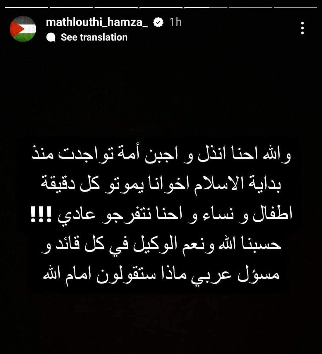 فيما عبر حمزة المثلوثي لاعب الزمالك عبر ستوري انستجرام: "والله احنا انذل أمة توجدت منذ بداية الاسلام اخوانا يموتو كل دقيقة اطفال ونساء واحنا نتفرجو عادي!!!"، وتابع في حديثه: "حسبنا الله ونعم الوكيل في كل قائد ومسؤل عربي ماذا ستقولون أمام الله".
