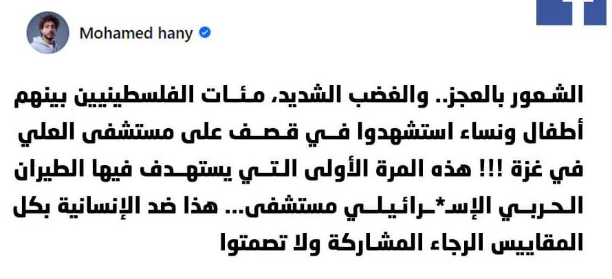 وكتب هاني في بيان مقتضب عبر حسابه الرسمي بموقع التواصل الاجتماعي "فيس بوك": "الشعور بالعجز.. والغضب الشديد"، وأضاف: "مئات الفلسطينيين بينهم أطفال ونساء استشهدوا في قصف على مستشفى العلي في غزة!!".