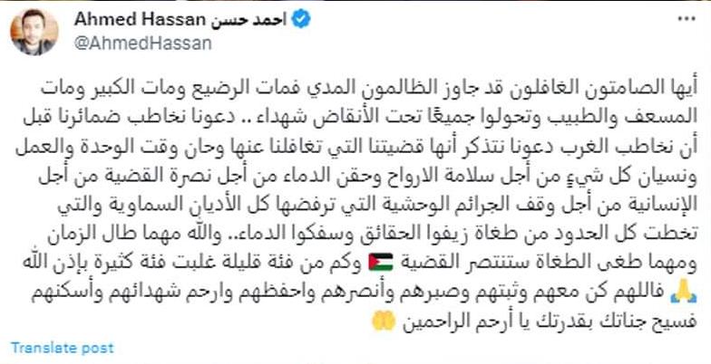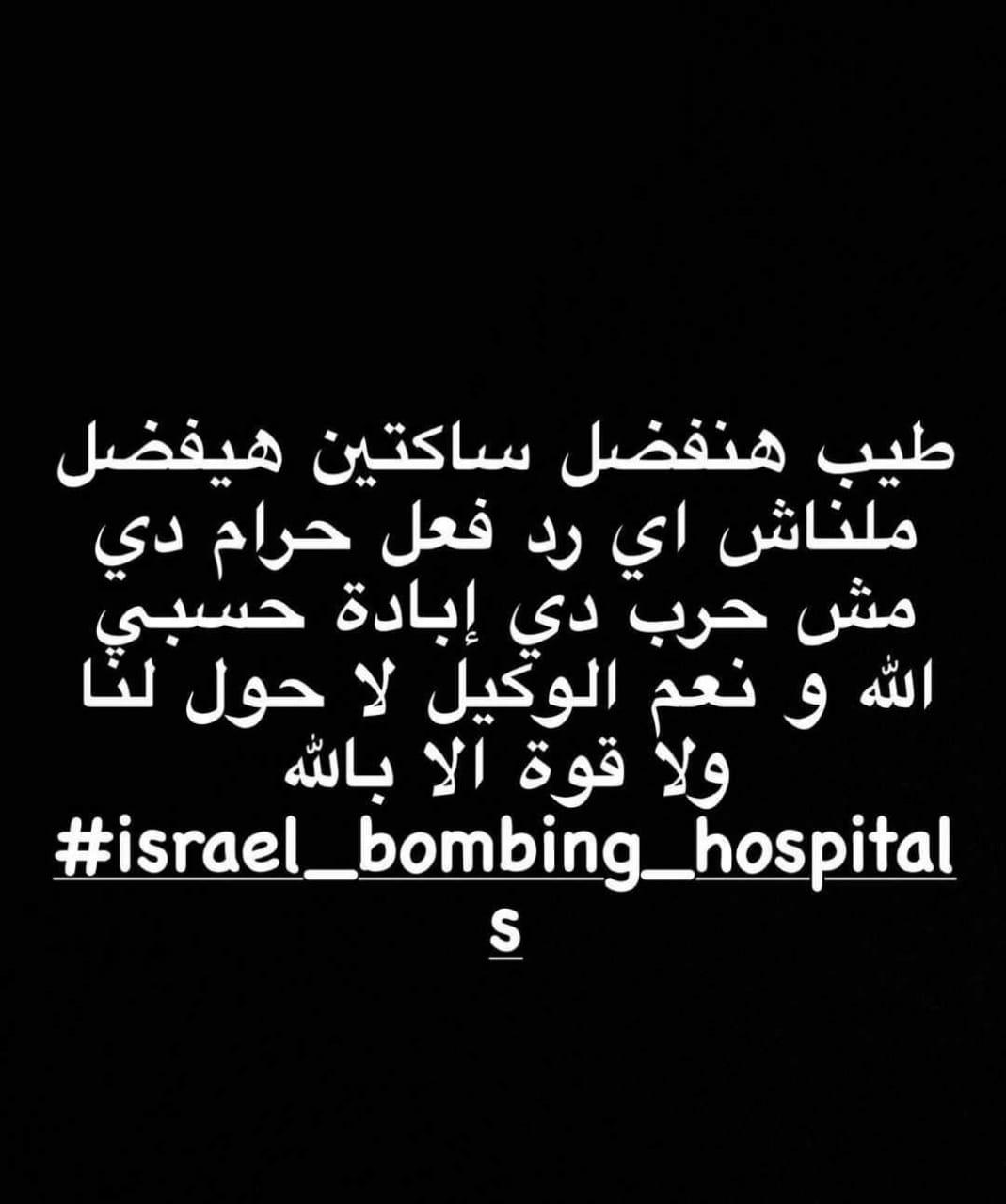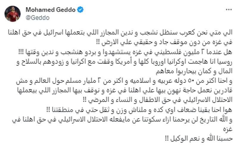 فيما كتب عمرو السولية لاعب الفريق الأول لكرة القدم بالنادي الأهلي: "الواحد مش عارف يكتب ايه يعبر عن اللى جواه بننام وبنصحى على مجزرة جديدة فى حق أخواتنا فى غزة إبادة جماعية لشعب بيدافع عن أرضه عن حقه عن شرفه والعالم كله بيتفرج من بعيد ودول مش شايفه إللى بيحصل وييجوا يتكلموا عن حقوق الإنسان وحرية الرأى انت حتى بتمنع الناس تقول رأيها".