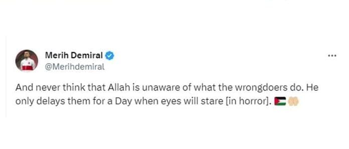 وكتب ميريح ديميرال لاعب أهلي جدة والمنتخب التركي: "ولا تحسبن الله غافلا عما يعمل الظالمون. إنما يؤخرهم ليوم تشخص فيه الأبصار".