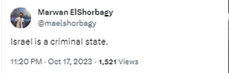 ومروان الشوربجي لاعب الاسكواش عبر توتير دعم غزة قائلاً: "إسرائيل دولة إجرامية".