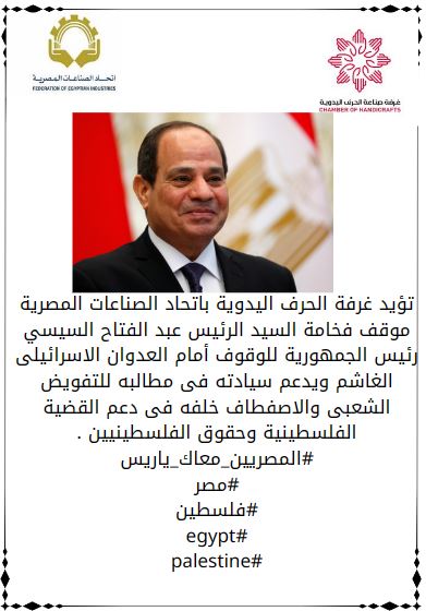 أعلن مجلس إدارة غرفة الحرف اليدوية باتحاد الصناعات المصرية تفويض الرئيس السيسي للوقوف أمام العدوان الإسرائيلي الغاشم ويفوض مجلس إدارة الغرفة والعاملين بالقطاع والمقدر أعدادهم بالألأف الرئيس عبد الفتاح السيسي في أتخاذ مايراة مناسباً لدعم القضية الفلسطينة وحقوق الفلسطنين.