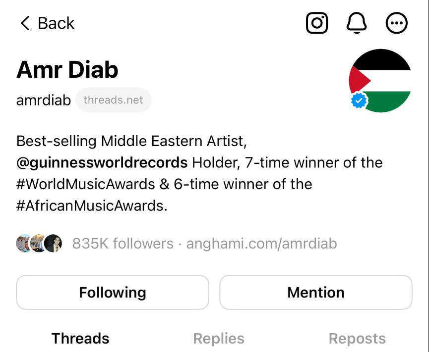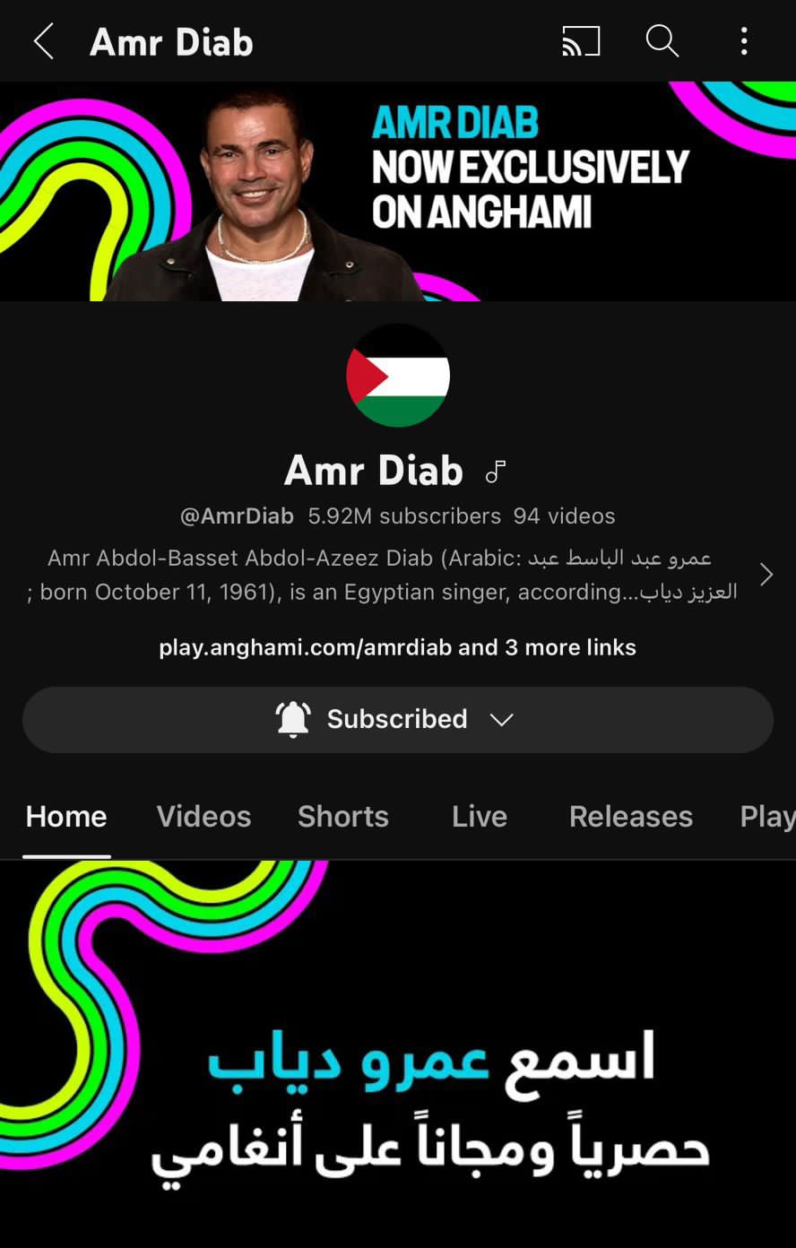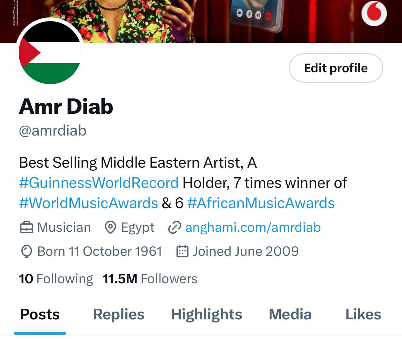 وقام الفنان عمرو دياب بتغيير كافة صوره عبر مواقع التواصل الاجتماعي وكذلك عبر حسابه الرسمي على منصة انغامي، واستبدالها جميعا بصورة العلم الفلسطيني في إعلان واضح لتضامنه مع الشعب الفلسطيني العربي.