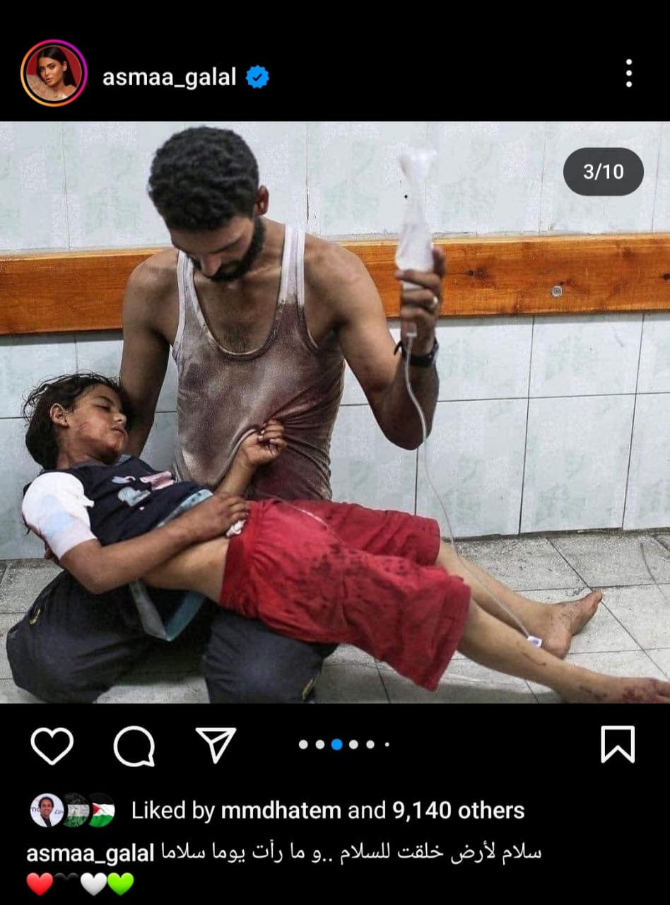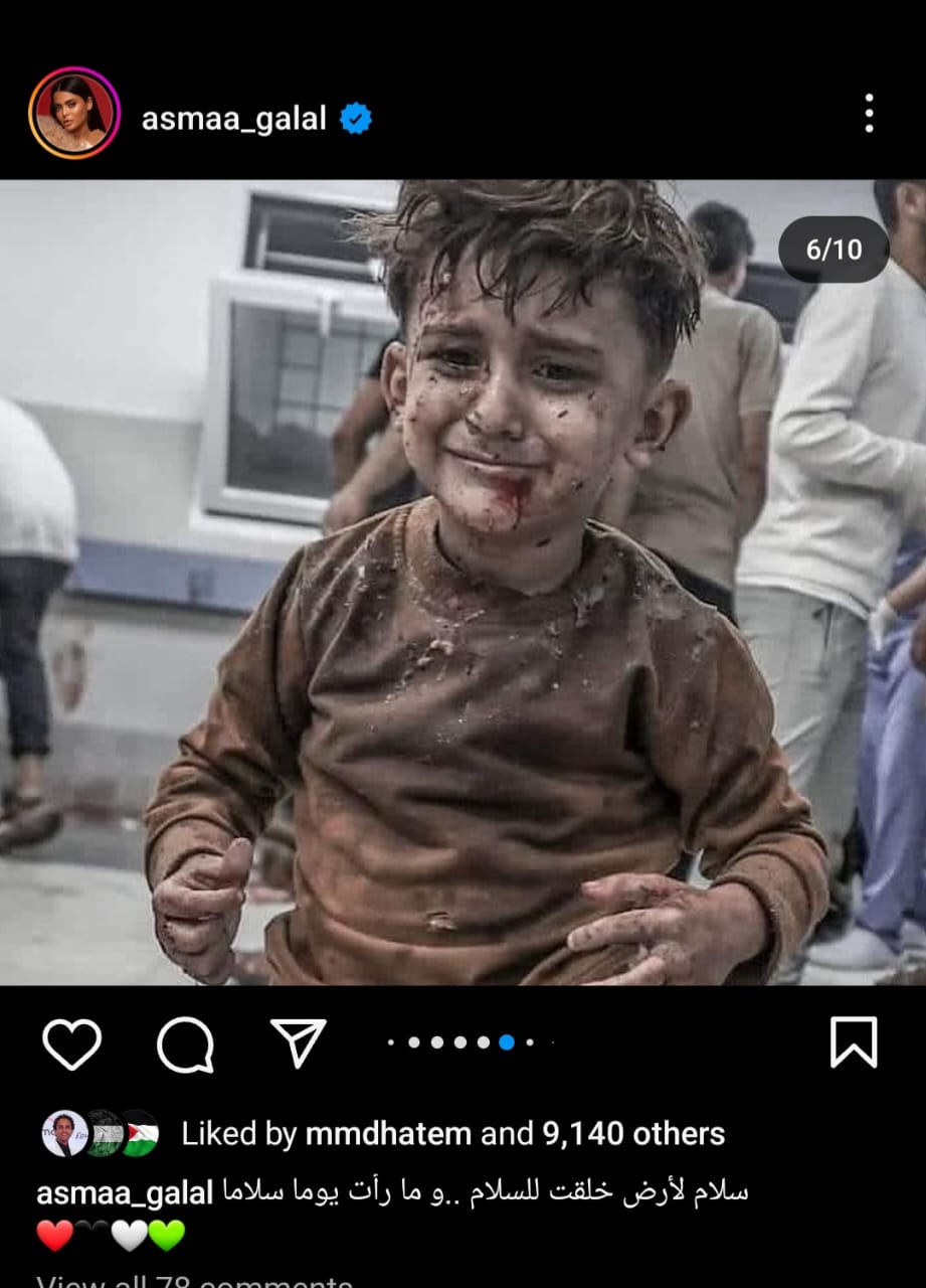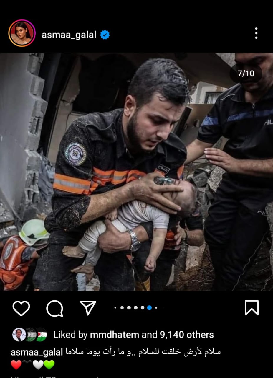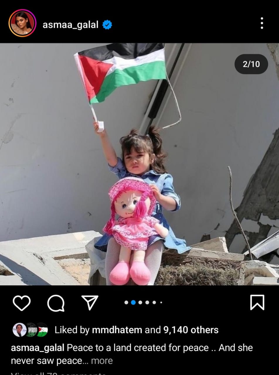 شارك الفنانة أسماء جلال جمهورها بعدة صور دعمت فيها الشعب الفلسطيني في مواجهة الإحتلال الإسرائيلي الغاشم، وذلك عبر حسابها الخاص بموقع تبادل الصور والفيديوهات "انستجرام".