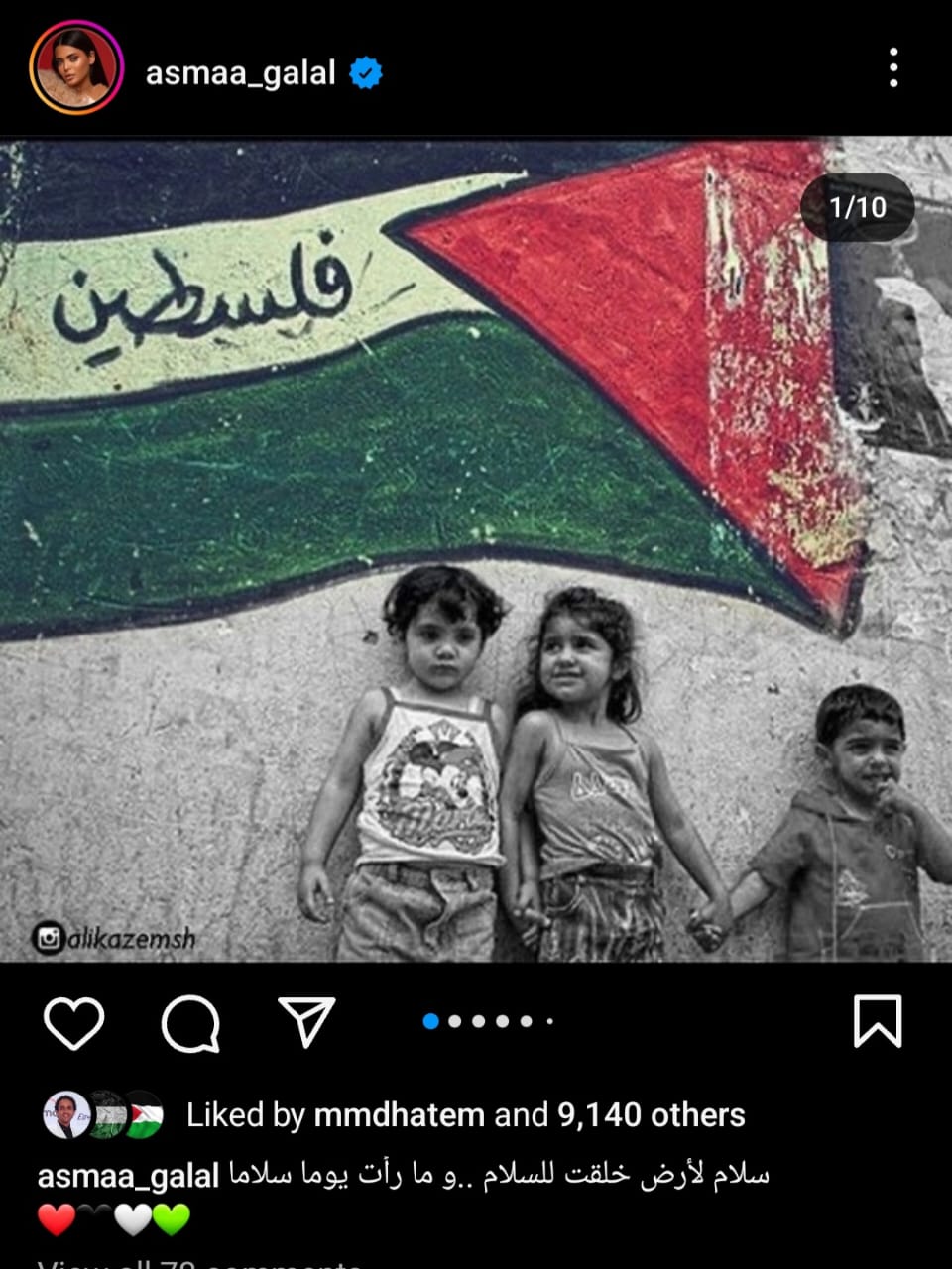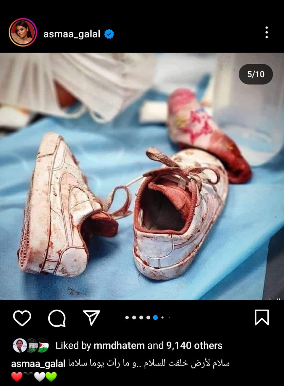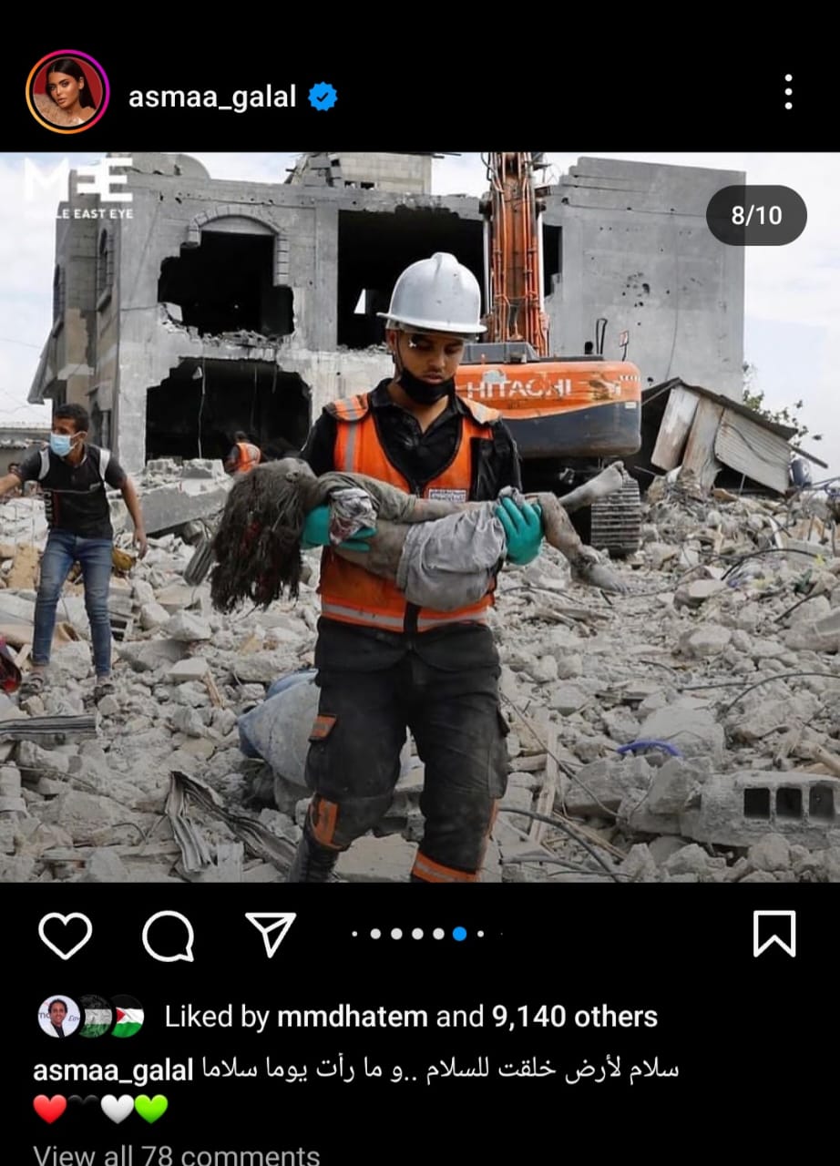شارك الفنانة أسماء جلال جمهورها بعدة صور دعمت فيها الشعب الفلسطيني في مواجهة الإحتلال الإسرائيلي الغاشم، وذلك عبر حسابها الخاص بموقع تبادل الصور والفيديوهات "انستجرام".