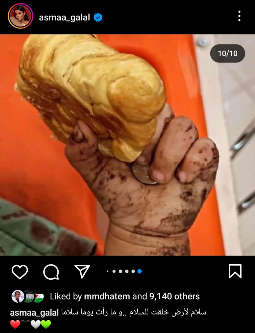 وعلى طريقتها الخاصة، دعمت أسماء جلال الشعب الفلطسيني، وذلك عبر حسابها الخاص بموقع تبادل الصور والفيديوهات"انستجرام".