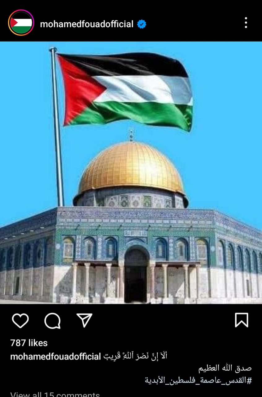 وشارك الفنان محمد فؤاد جمهوره بصورة للمسجد الأقصى،وذلك عبر حسابه الخاص بموقع تبادل الصور والفيديوهات"انستجرام"، وعلق قائلا"إلا إن نصر الله قريب صدق الله العظيم".