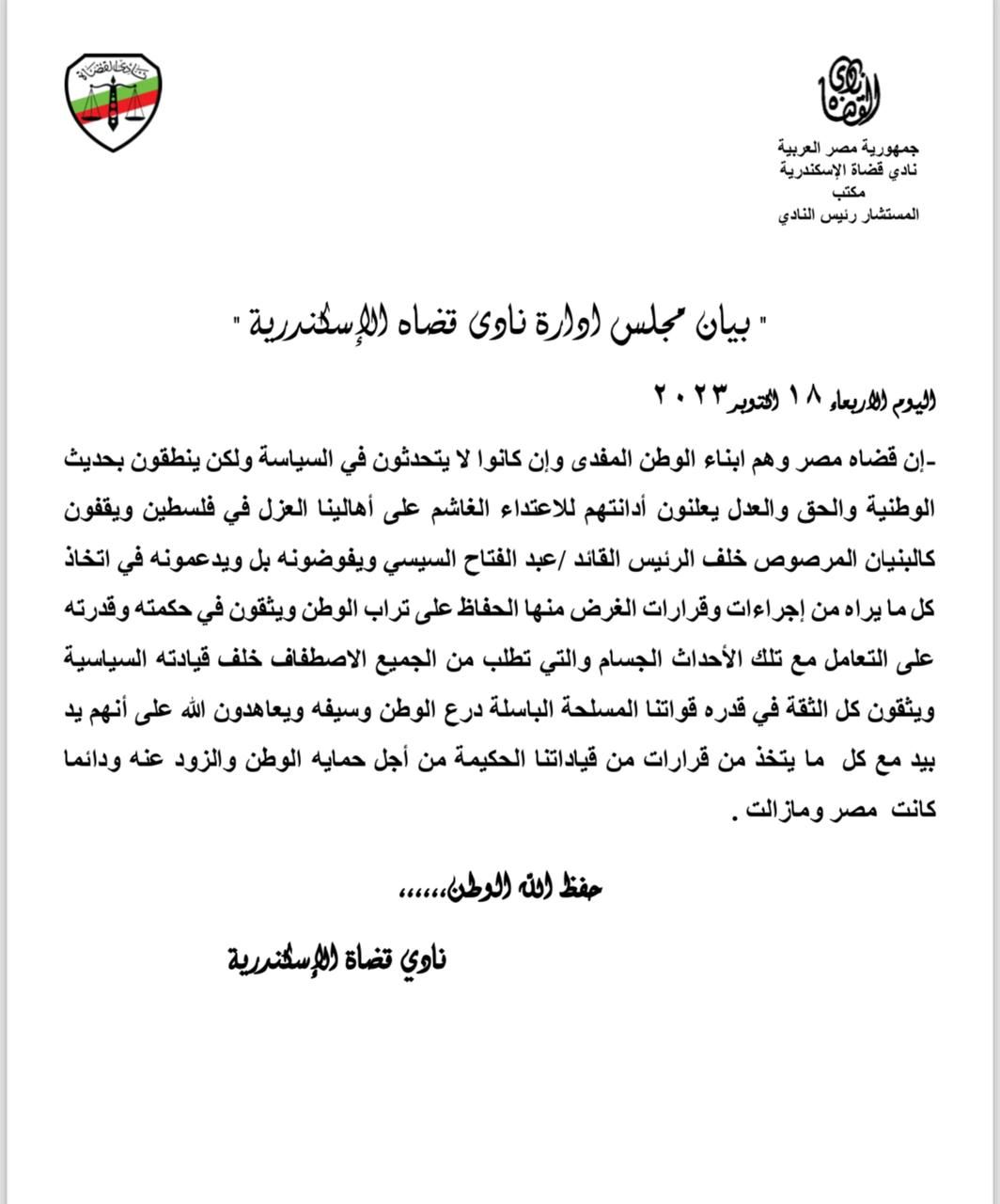 وأصدر نادي القضاة بالإسكندرية بيانا اليوم مفاده: “إن قضاة مصر وهم أبناء الوطن المفدى وإن كانوا لا يتحدثون في السياسة ولكن ينطقون بحديث الوطن والحق والعدل، ويعلنون إدانتهم للاعتداء الغاشم على أهالينا العزل في فلسطين..”.