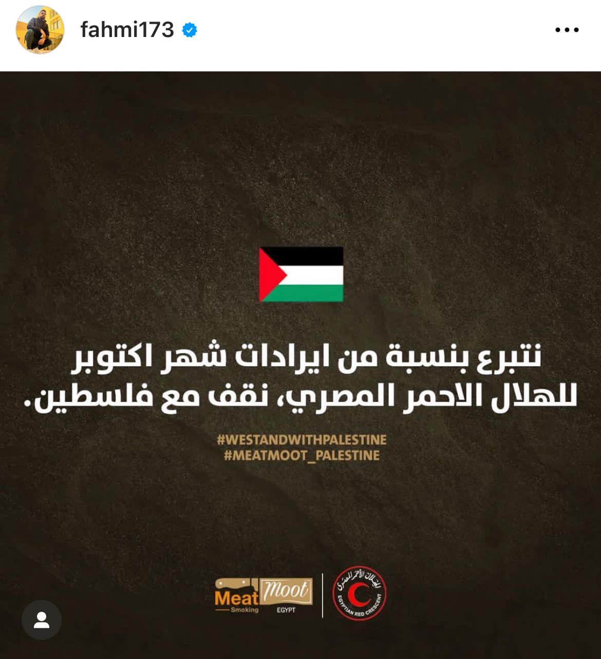 وكتب أحمد فهمي عبر صفحته على موقع تبادل الصور والفيديوهات "إنستجرام" قائلا:" نتبرع بنسبة من إيرادات شهر أكتوبر لصالح الهلال الأحمر المصري نقف مع فلسطين".