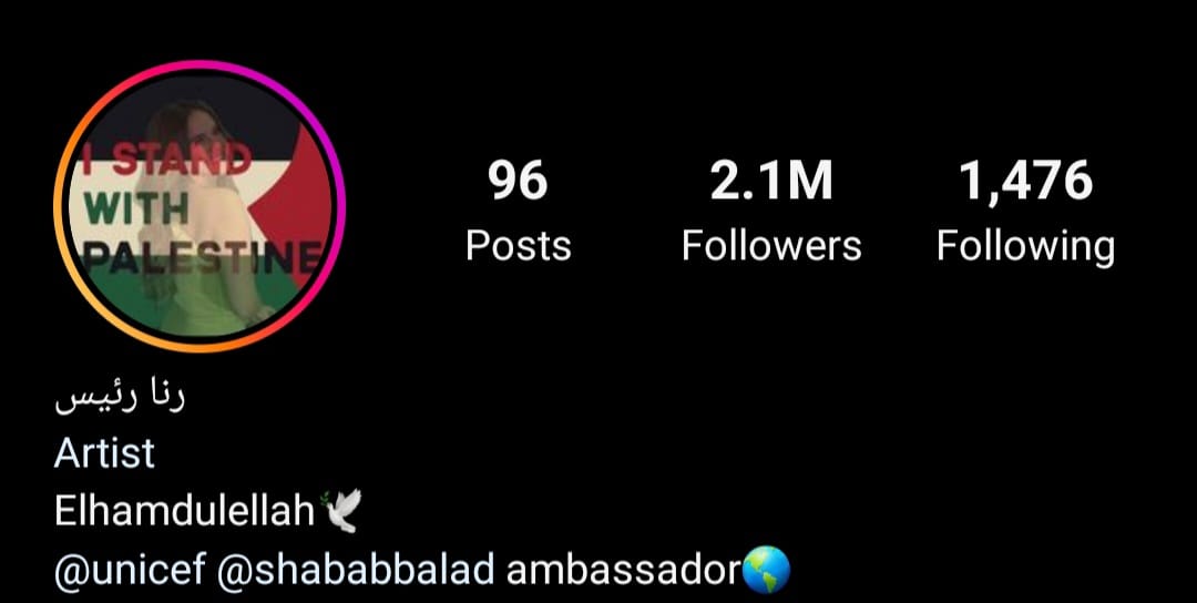 وقامت الفنانة رنا رئيس بتغيير صورة الملف الشخصي لها"البروفايل" للعلم الفلسطيني عبر حسابها الخاص بموقع تبادل الصور والفيديوهات"انستجرام".