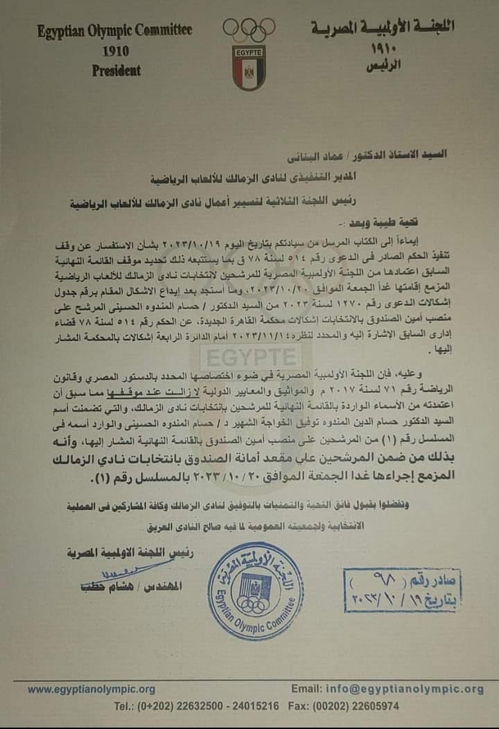 أرسلت اللجنة الأولمبية خطاب رسمي للجنة الثلاثية المكلفة بادارة شؤون نادي الزمالك، خطاب تعلن فيه عوة حسام المندوه المرشح على منصب أمين الصندوق، للسباق الانتخابي المحدد له غدا الجمعة، لاختيار مجلس إدارة جديد يدير شؤون القلعة البيضاء لمدة 4 سنوات مقبلة حتى عام 2027.