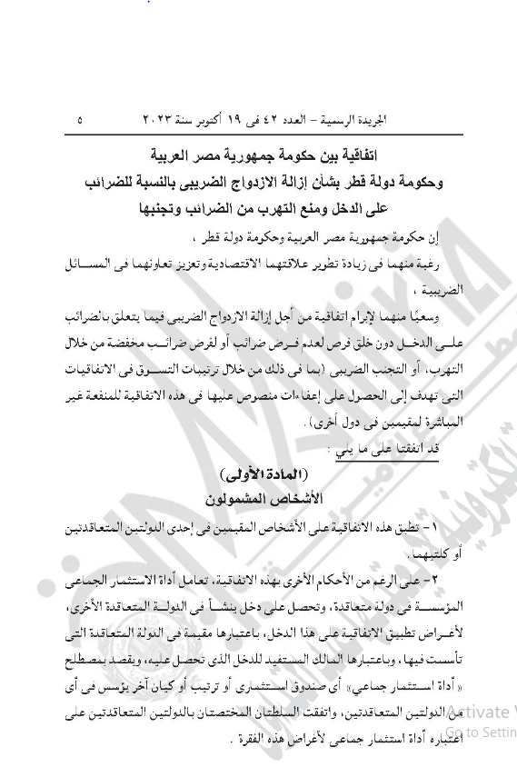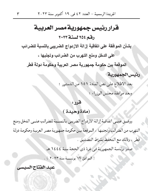 ونص القرار الجمهوري في مادته الأولى على “الموافقة على اتفاقية إزالة الازدواج الضريبي بالنسبة للضرائب على الدخل ومنع التهرب من الضرائب وتجنبها، الموقعة بين حكومة جمهورية مصر العربية وحكومة دولة قطر، وذلك مع التحفظ بشرط التصديق”.