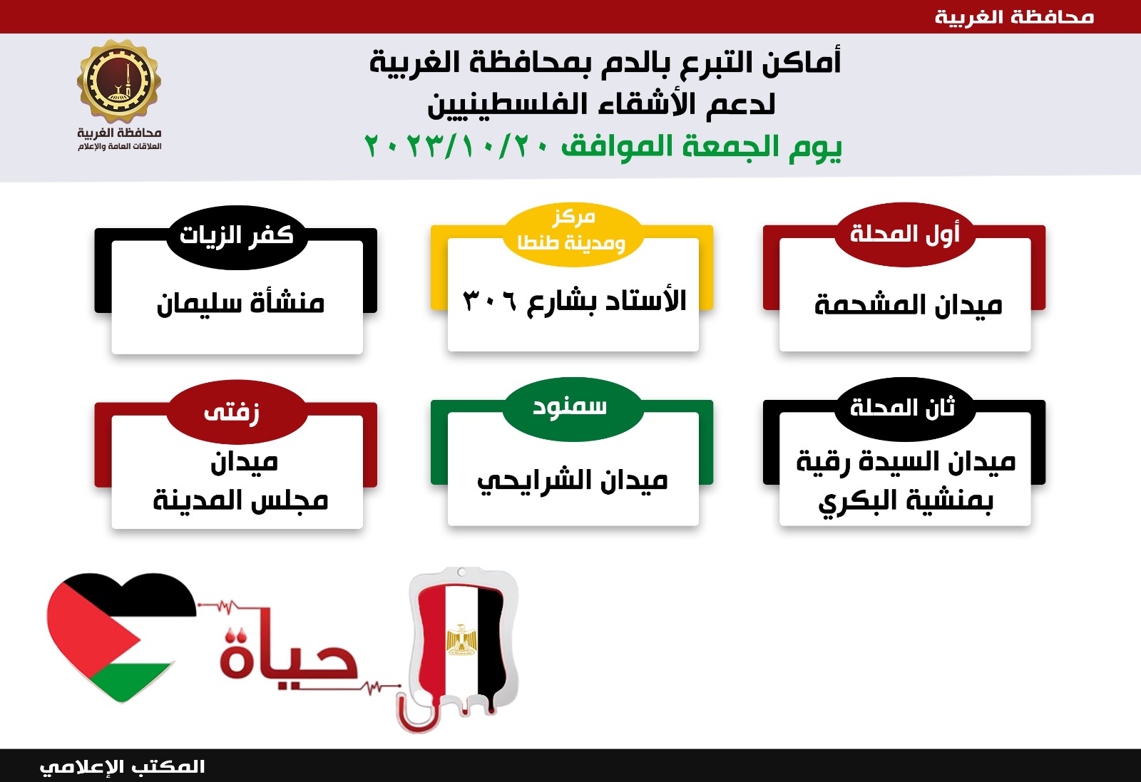 أعلن الدكتور طارق رحمي محافظ الغربية اماكن حملة التبرع بالدم ليوم غدا الجمعة الموافق 20\10\2023، تضامنا مع الأشقاء الفلسطينيين، تنفيذا لتوجيهات الرئيس عبدالفتاح السيسي رئيس الجمهورية؛ بدعم الأشقاء الفلسطينيين؛ من خلال تقديم الدعم الفوري، والإغاثة الإنسانية لهم؛ لتخفيف حدة أحداث العنف التي أدت إلى سقوط الكثير من الضحايا، والمصابين.
