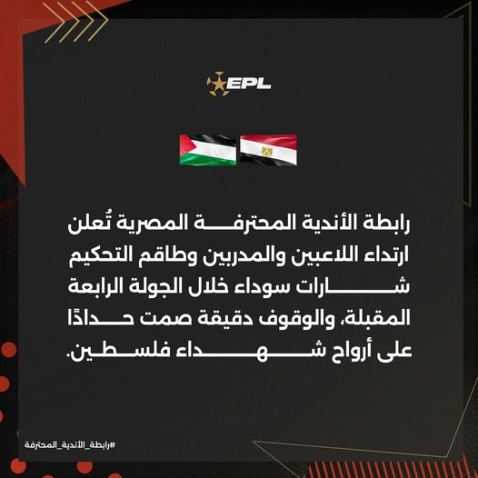 أعلنت رابطة الاندية المصرية عن ارتداء شارات سوداء والوقوف دقيقة صمت حدادًا على أرواح شهداء فلسطين بالجولة الرابعة من الدوري المصري.