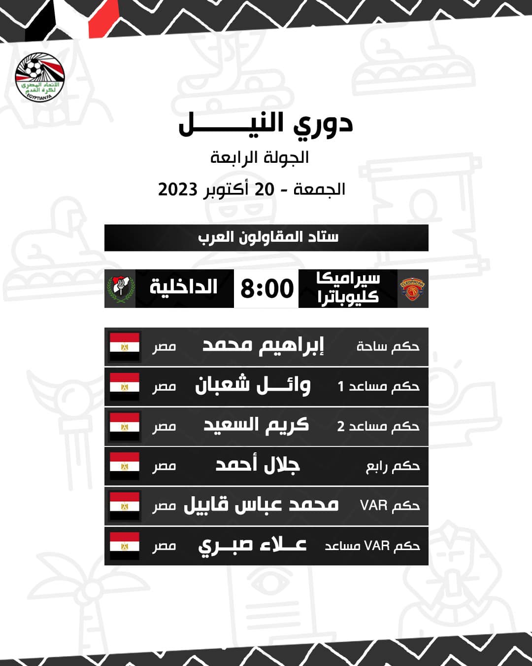 أعلنت لجنة الحكام بالأتحاد المصري لكرة القدم، أسماء حكام مباراة سيراميكا كليوباترا والداخلية، المقرر إقامتها اليوم الجمعة، باستاد المقاولون العرب فى الجولة الرابعة بالدوري المصري الممتاز.