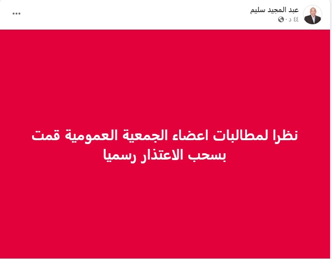 وكتب عبد المجيد سليم عبر حسابه على موقع التواصل الاجتماعي "فيس بوك" اليوم: "نظرا لمطالبات اعضاء الجمعية العمومية قمت بسحب الاعتذار رسميا".