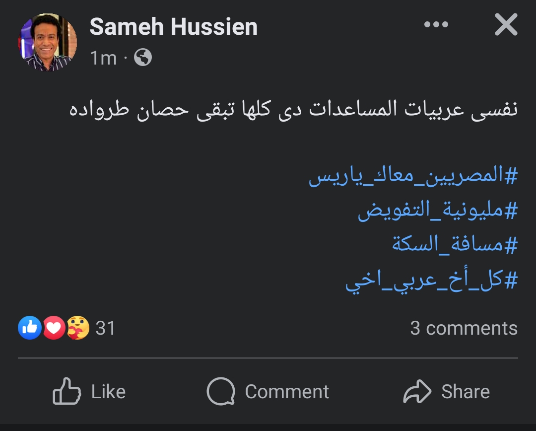 كتب سامح حسين منشور على صفحته الرسمية عبر موقع التواصل الاجتماعي “ فيسبوك ” و علق قائلا “ نفسي عربيات المساعدات دي كلها تبقى حصان طروادة ” .