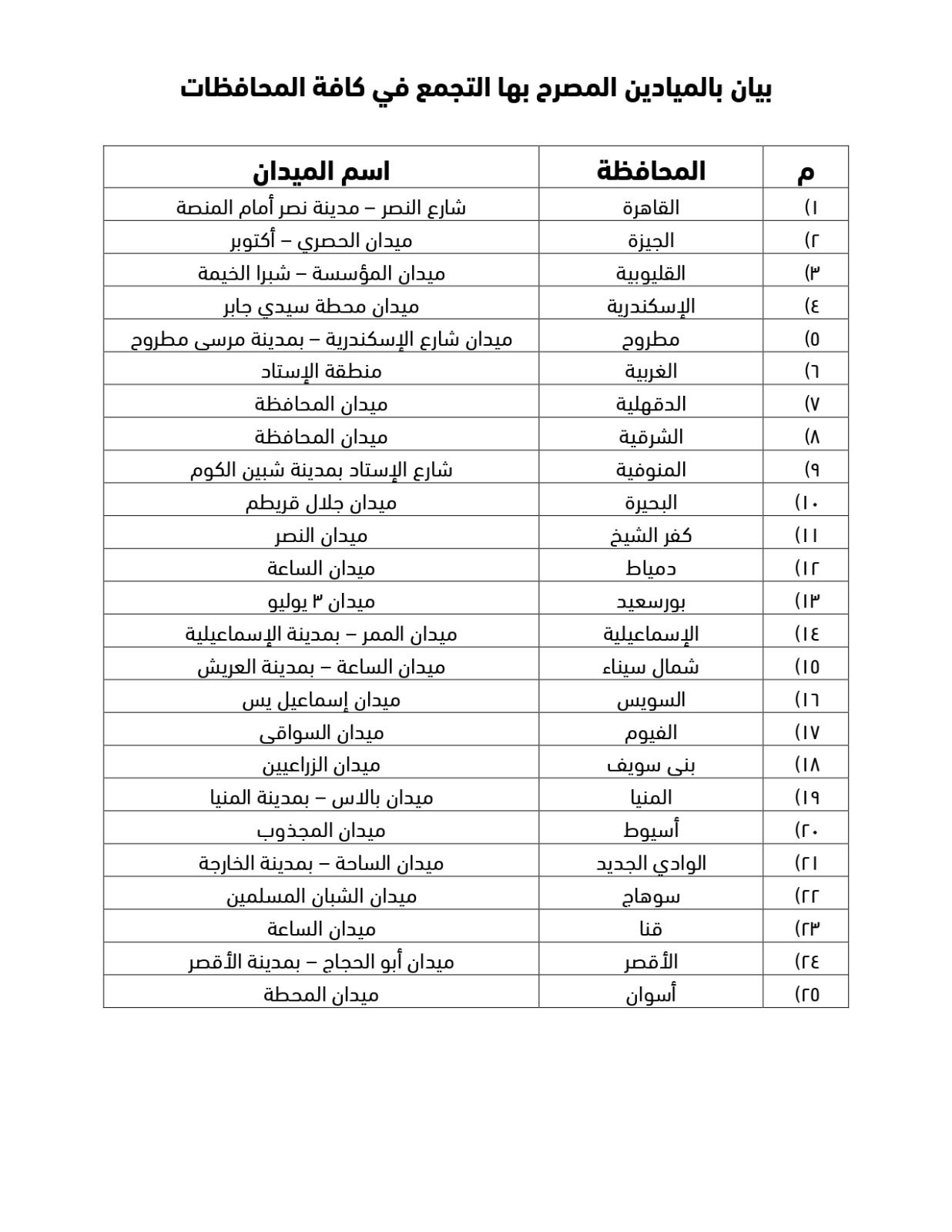 وخصصت القوى السياسية عدة ميادين لاستقبال المتظاهرين فيما يبدو أن هناك استجابة كبيرة لهذه الدعوات من كافة أطياف الشعب.