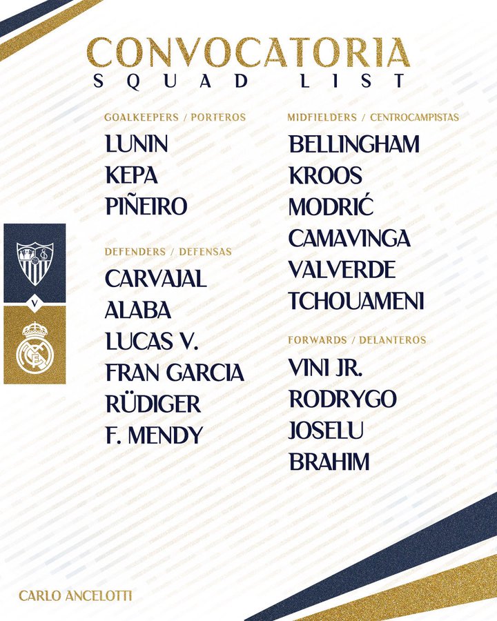 أعلن كارلو انشيلوتي المدير الفني لنادي ريال مدريد عن قائمة فريقه لمواجهة اشبيلية ، ضمن منافسات الجولة العاشرة من عمر الدوري الاسباني.