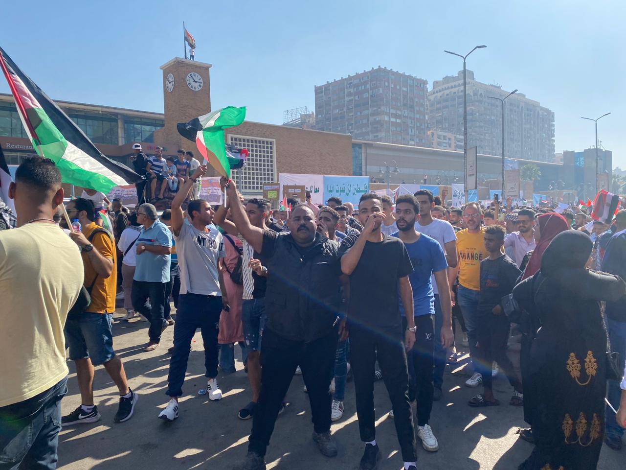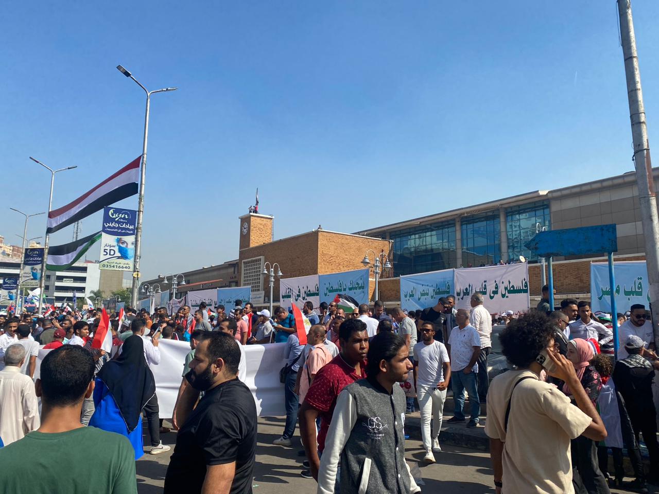 وحمل الأهالي أعلام فلسطين بجانب العلم المصري، ولافتات لصور الشهداء وضحايا القصف العدواني على مستشفى الاهلي المعمداني في قطاع غزة، بين هتافات " يا فلسطين يا فلسطين احنا معاكي ليوم الدين"، “القضية زي ما هي فلسطين عربية”، “ يا شهيد نام وارتاح واحنا نكمل الكفاح”.