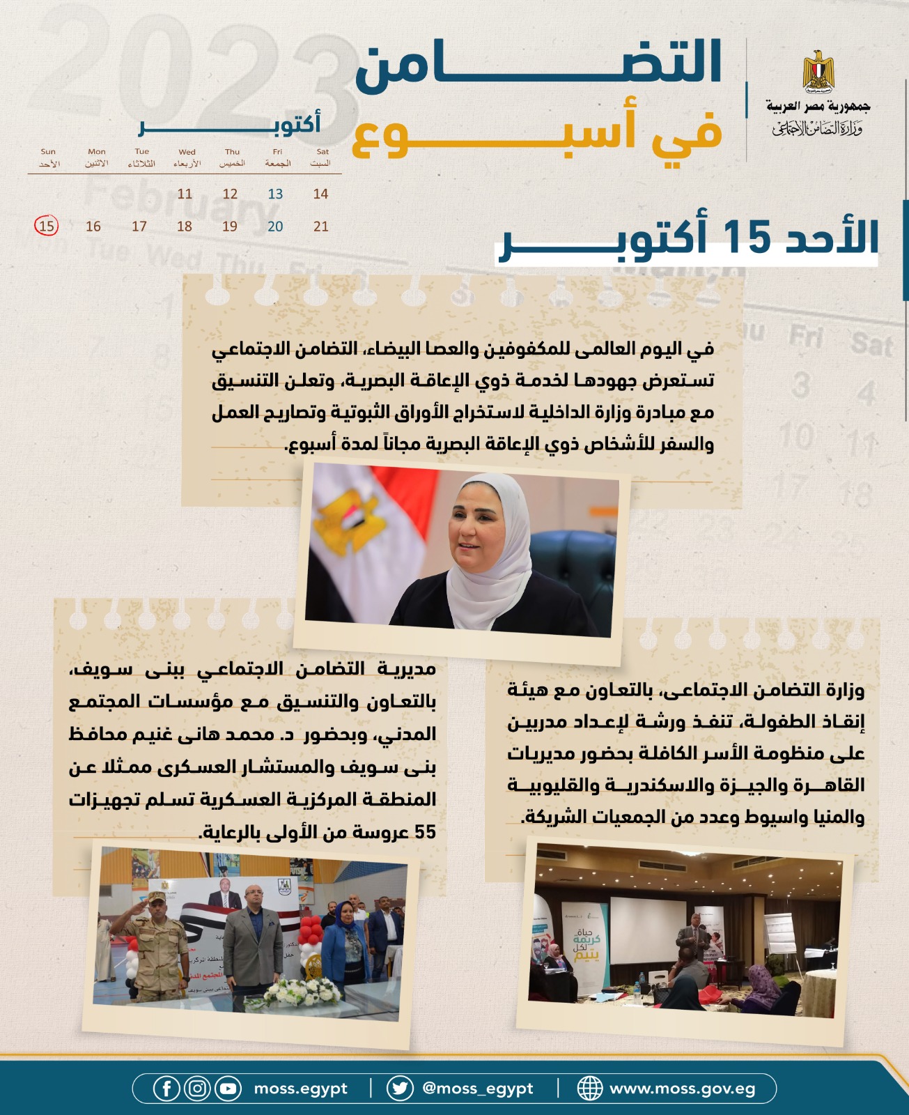 - في اليوم العالمى للمكفوفين والعصا البيضاء، التضامن الاجتماعي تستعرض جهودها لخدمة ذوي الإعاقة البصرية، وتعلن التنسيق مع مبادرة وزارة الداخلية لاستخراج الأوراق الثبوتية وتصاريح العمل والسفر للأشخاص ذوي الإعاقة البصرية مجاناً لمدة أسبوع.